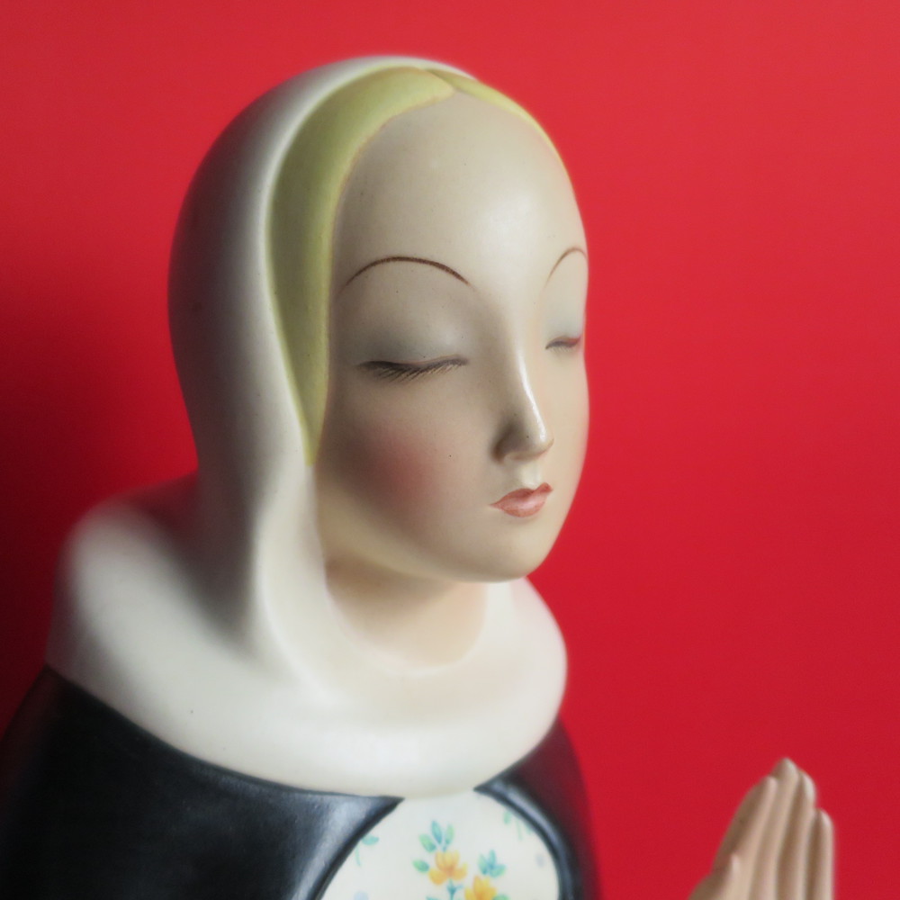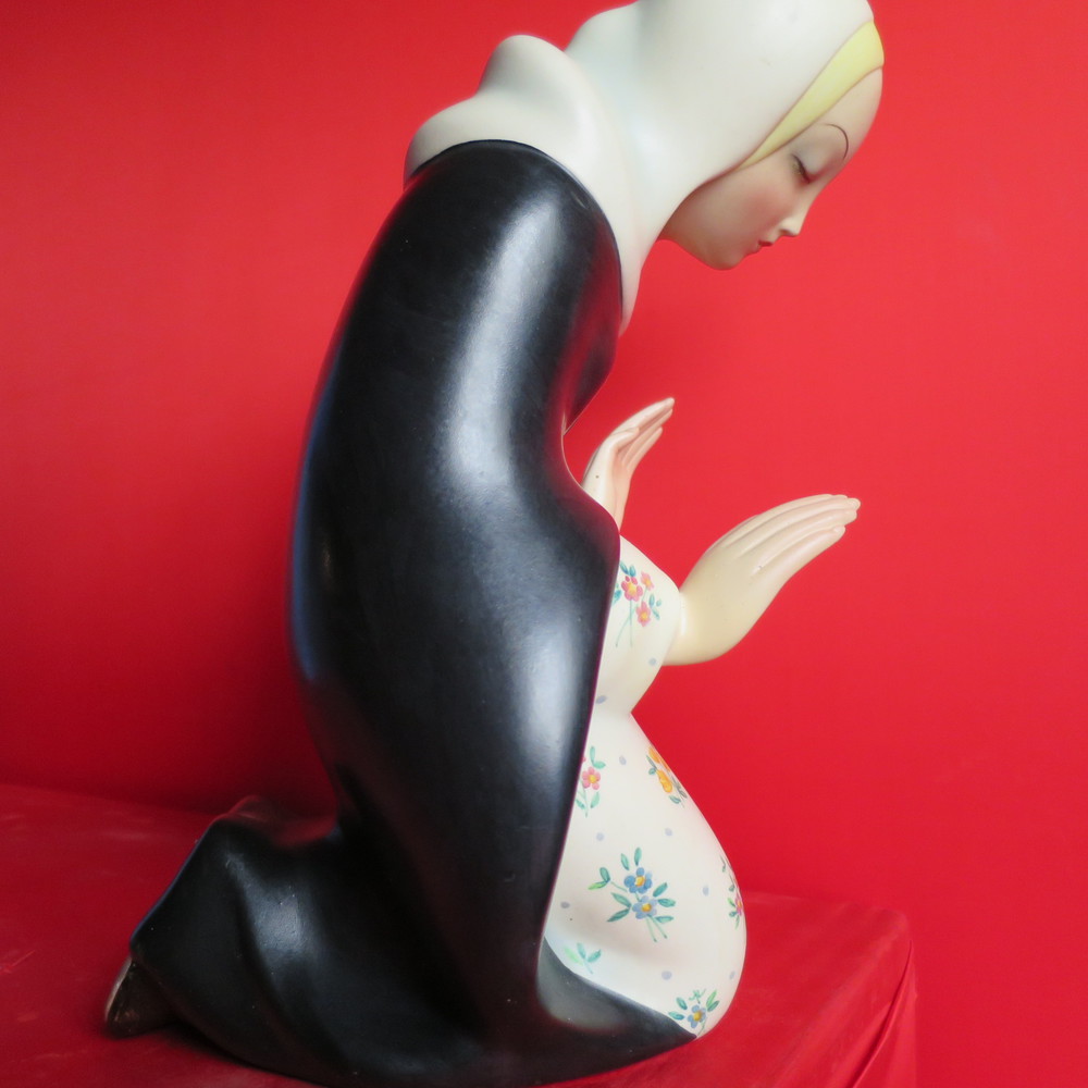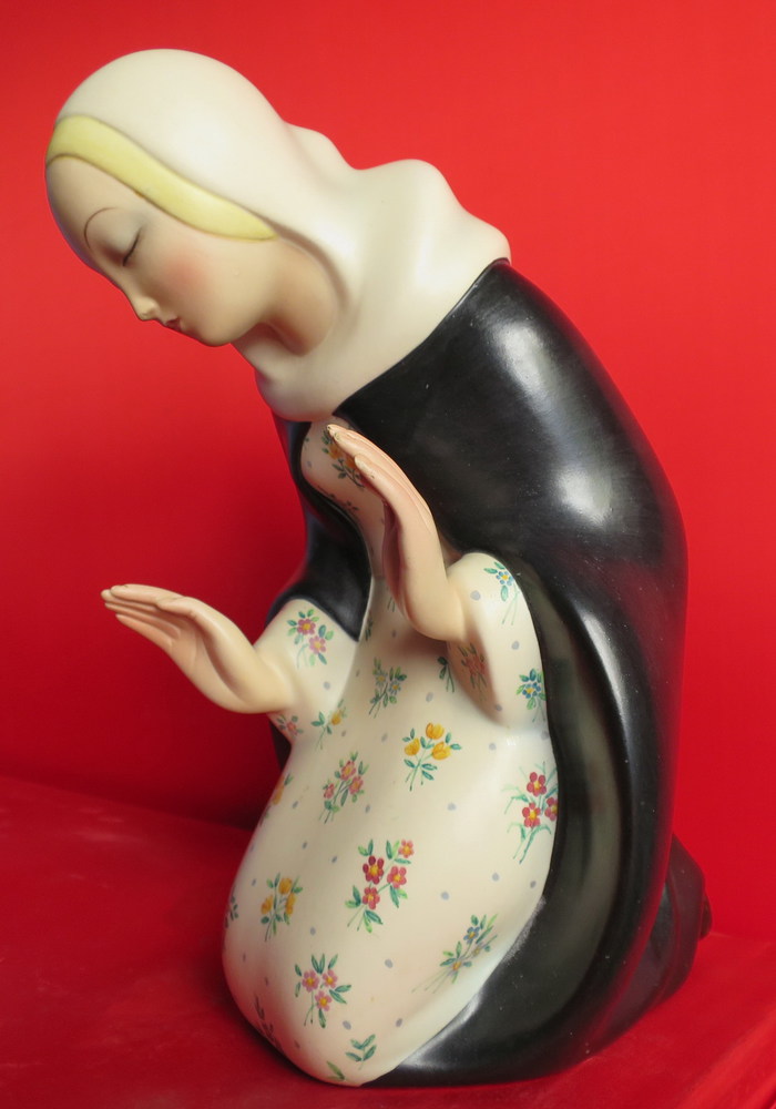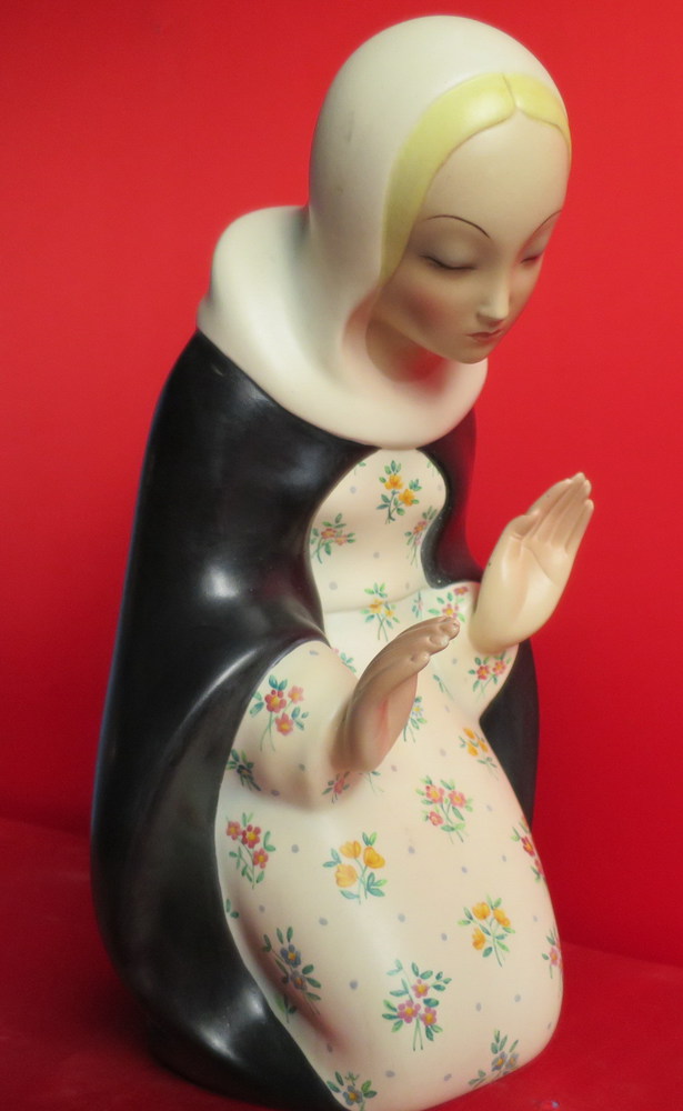 PAOLA BOLOGNA per LENCI - 'MADONNA' Figura in ceramica smaltata e dipinta in policromia raffigurante una Madonna adorante inginocchiata. 28 cm Marcata sotto la base 'Lenci made in italy 3-37 con simbolo del decoratore Domenico Cogno. Produzione Ceramiche Lenci, Torino, Italia, modello n° 432, ca 1937 su disegno di Paola Bologna (1898-1960) Bibliografia: A. Panzetta, 'Ceramiche Lenci. Catalogo Generale dell'Archivio storico 1928-1964', Allemandi, Torino 1992, tav. 505, pag. 189 'MADONNA' A LENCI POTTERY FIGURE OF AN ADORING VIRGIN. DESIGNED BY PAOLA BOLOGNA. ca 1937