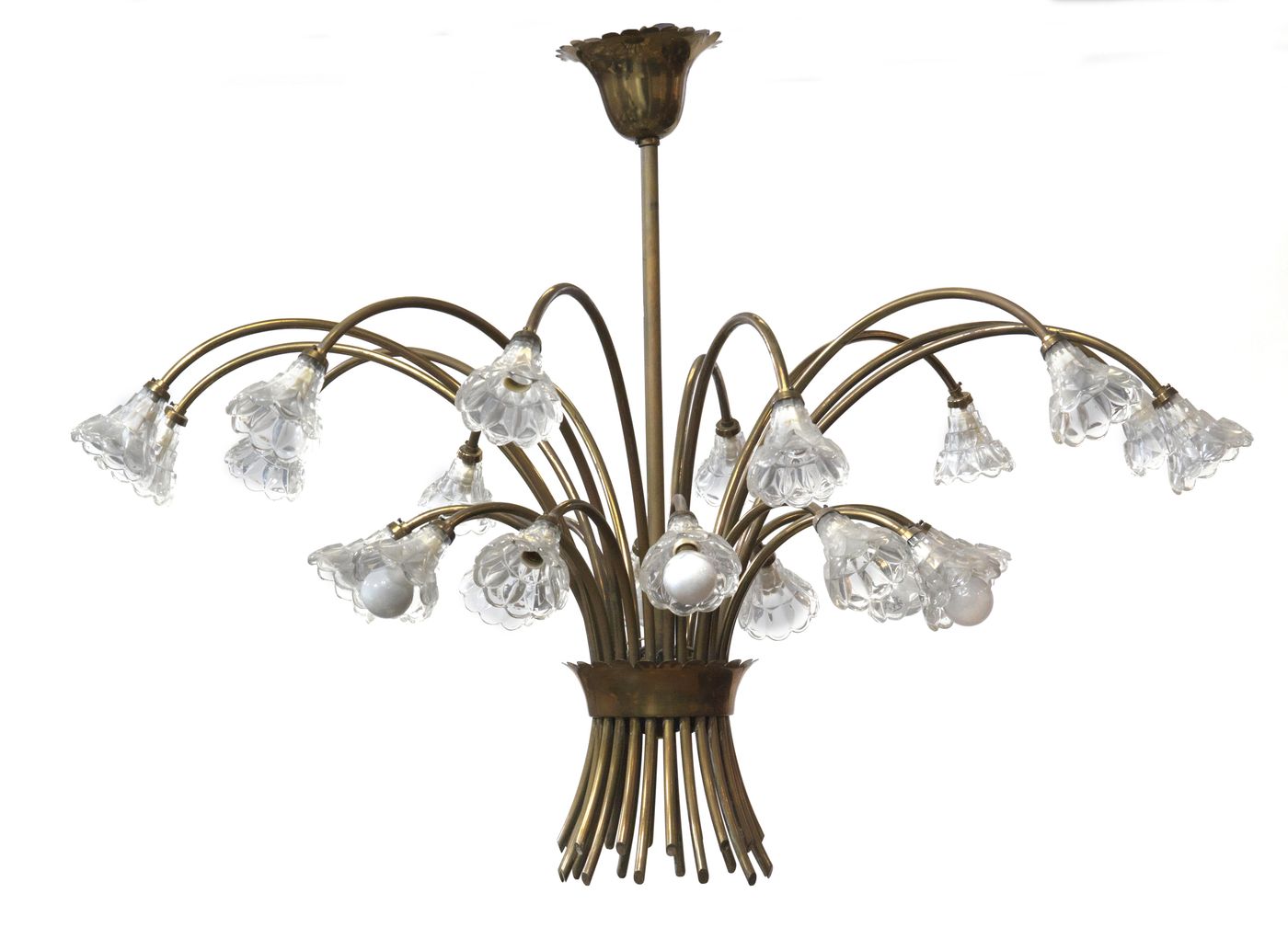LAMPADARIO Grande lampadario a cestino a 24 braccia in ottone zapponato con diffusori in vetro stampato. 1950 circa. cm 74x100