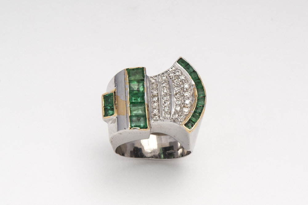 ANELLO IN ORO RODIATO, SMERALDI E DIAMANTI, ANNI '40 decorato con smeraldo e diamanti taglio brillante, Titolo dell'oro 750 rodiato. Peso gr 12,50 AN EMERALD, DIAMOND, RODHIUM 18K GOLD RING. 1940'S