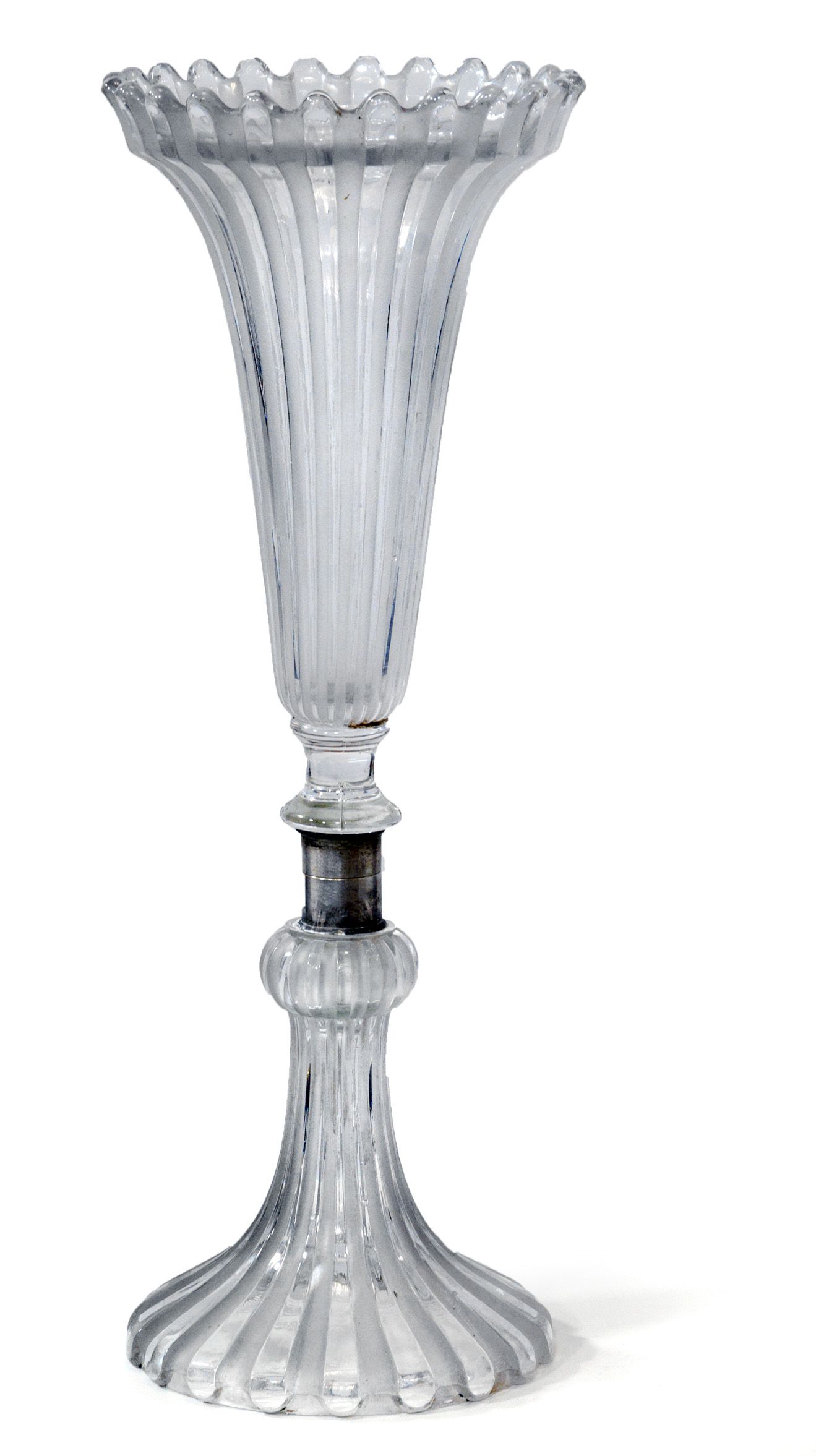 BACCARAT Vaso a due elementi in cristallo stampato, uniti da uno snodo filettato in ottone argentato. Marchio della manifattura ricavato nello stampo dell'elemento inferiore. 1930 circa h cm 47