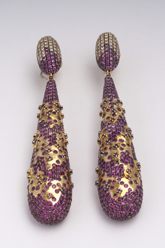 ORECCHINI PENDENTI IN ORO, RUBINI, ZAFFIRI ROSA E DIAMANTI decorati con...