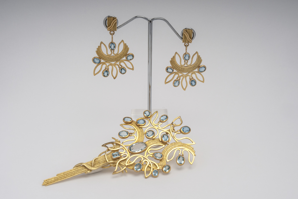 DEMI - PARURE IN ORO E ACQUAMARINE composta da una spilla e un paio di orecchini, realizzati dall'artista Pao, Peso g 37,60 A PAIR OF GOLD AND AQUAMARINE PENDENT EARRINGS & BROOCH SUITE