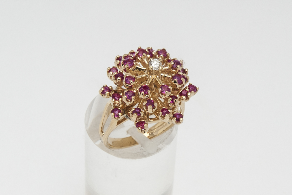 ANELLO IN ORO, DIAMANTE E RUBINI decorato con diamante centrale a taglio brillante, e 33 rubini, Peso g 8,50, misura 12 A DIAMOND, RUBY AND GOLD CLUSTER RING