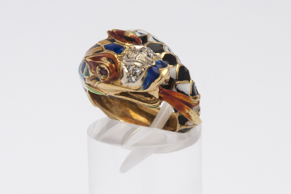 ANELLO IN ORO, DIAMANTI E SMALTI a forma di drago, decorato a smalti multicolor e diamanti taglio brillante di ct 0,10, Peso 13,40 A GOLD, DIAMOND AND MULTICOLOR ENAMEL RING