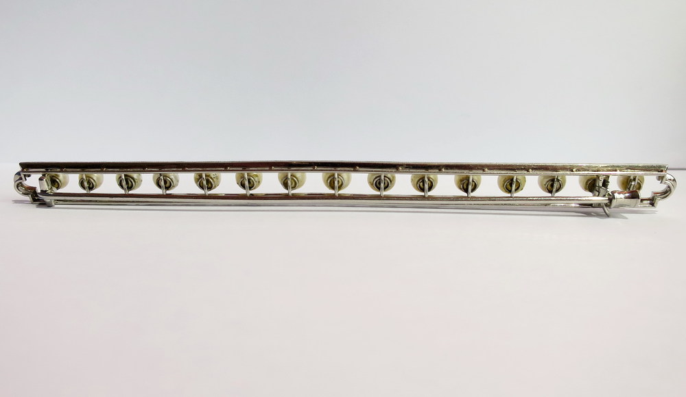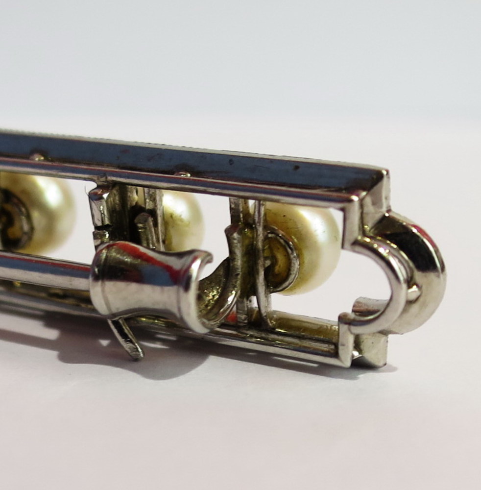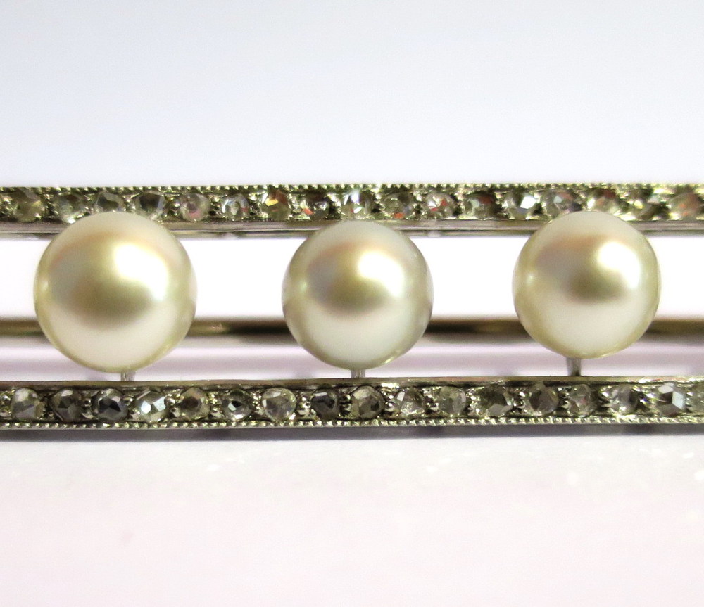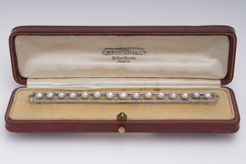 SPILLA IN PLATINO, PERLE E DIAMANTI , FRANCIA 1820 ca. decorata con 15 perle e diamanti scatola originale di CH FONTANA & C. PARIS Lunghezza cm 12,6 A FRENCH PLATINUM, PEARL AND DIAMOND BROOCH. 1820 ca