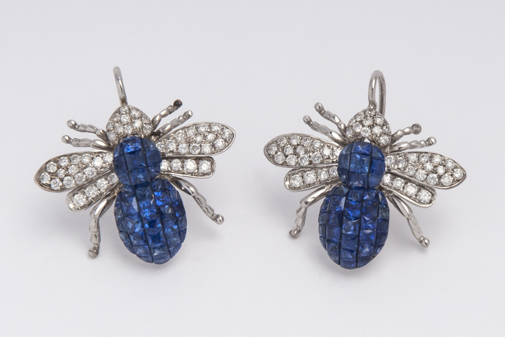 ORECCHINI IN ORO BIANCO, ZAFFIRI INVISIBILI E DIAMANTI a forma di api, corpo...