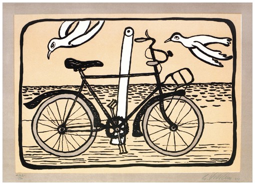 GIUSEPPE VIVIANI Agnano Pisano 1898 – Pisa 1965 La bicicletta 1961 Litografia a 3 colori. Firma e data in b. a d. + timbro a secco dell’artista “Tarde sed tuto”. (51,8 x 70,5 foglio – 50,4 x 69,2 lito.) Editori: Vanni Scheiwiller, Milano – Paolo Belforte, Livorno. Tiratura: 170 es. num. arabi su carta uso mano incollata su cartoncino beige 57 x 76,5. Pubbl.: “Giuseppe Viviani Catalogo Generale” a cura di Silvio Guarasci Pisa, Editore Saletta d’Arte Viviani s.a.s. Pisa, Stampatore Pacini S.p.a. Pisa, ottobre 2015, p.17. B.A.:A OFFERTA