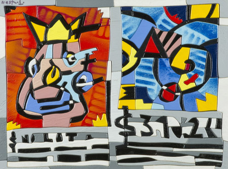 Ugo Nespolo (Mosso Santa Maria (Bi) 1941 ) No lot Acrilici su legno intarsiato, cm. 30x40 Firmato in alto a sinistra. Sul verso: titolo e timbro dell'Artista. Autentica dell'Artista su foto.