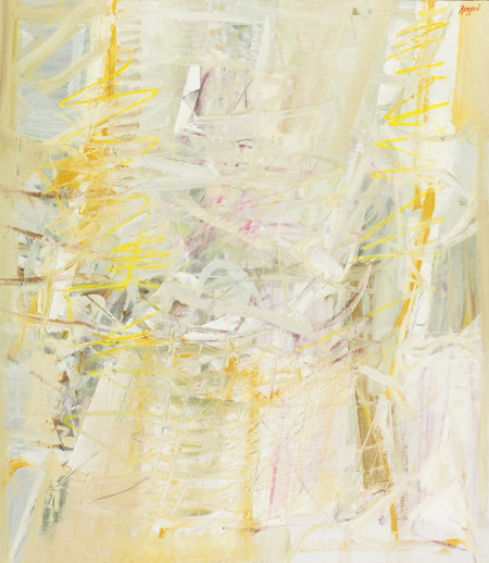 Piero Ruggeri (Torino 1930 2009) Composizione per un paesaggio 1963 Olio su tela, cm. 85x73,5 Firmato in alto a destra; Sul verso: firma, data e titolo. Certificato di provenienza "Galleria D'Arte Sant'Agostino, To".
