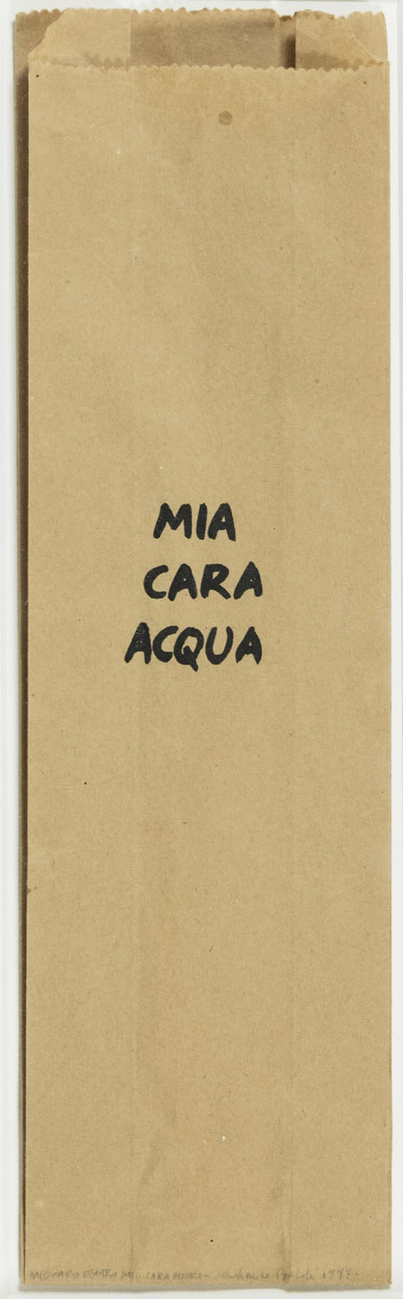 Luciano Bartolini (Fiesole 1948 Fiesole 1994) Mia cara acqua 1977 Acrilico su carta gialla, cm. 35x10 Firma e data in basso al centro; Sul verso: etichetta e timbro "Aurelio Stefanini Studio d'Arte", Firenze, con descrizione