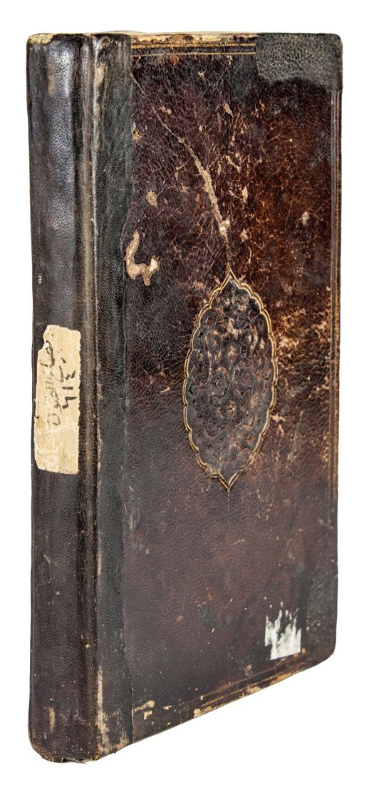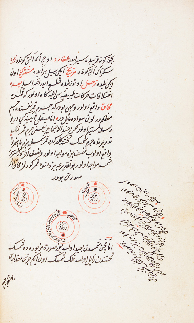 Manoscritto cartaceo (mm 208x230). Carte [100]. Testo in turco vergato in inchiostro rosso e nero, con 5 diagrammi del sistema astronomico tolemaico. Legatura coeva in pieno vitello con dorso e parte dei piatti ricostruiti, decorata da un arabesco impresso a secco al centro dei piatti e contornato da filetto dorato; tassello cartaceo con titolo al dorso. Con molte annotazioni marginali.