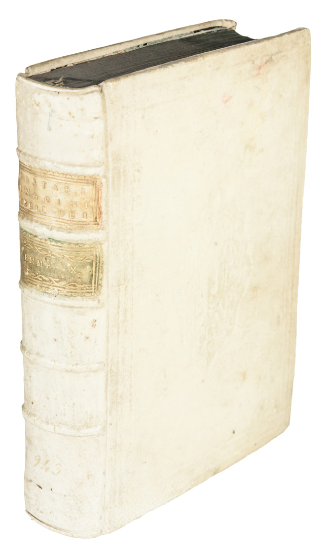 In-4° (mm 195x140). Pagine [30] (di 32, manca la carta bianca), 418, con l'ultima carta bianca presente ma unita al foglio di guardia. Marca tipografica incisa in rame al frontespizio, capilettera filigranati e finalini incisi in legno. Con molte belle figure incise in rame a 3/4 di pagina nel testo. Lievi arrossature. legatura settecentesca in piena pergamena con grande fregio arabeggiante impresso a secco al centro dei piatti inquadrato da cornici di filetti e a catenella impressi sempre a freddo; titoli dorati su falso tassello al dorso.