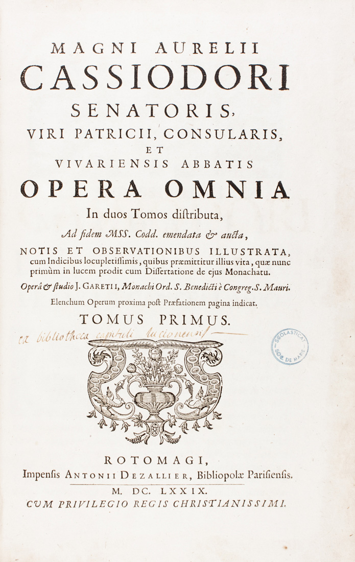 Cassiodorus Flavius Magnus Aurelius, Opera omnia in duobus tomos distributa, ad fidem mss. codd. emendata & aucta, notis et observationibus illustrata [...]. Opera & studio J. Garetii...