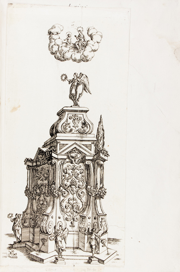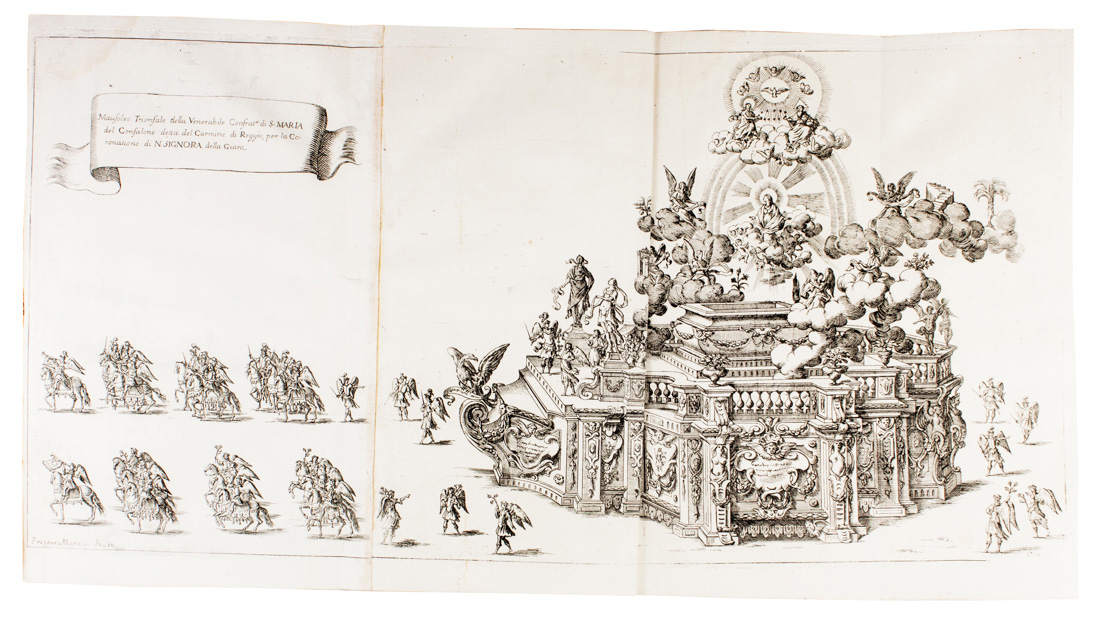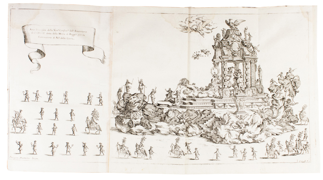 In-folio (mm 355x238). Pagine [16], 137, [7] con 1 antiporta raffigurante la Vergine e il Bambin Gesù e 1 ritratto del Dedicatario entro elaborate cornici architettoniche e 15 belle tavole di cui 11 più volte ripiegate e una applicata in fine di volume, il tutto finemente inciso all'acquaforte da Giuseppe Maria Mitelli. Esemplare ben completo della figura relativa alla macchina della Confraternita di S. Rocco che mostra il tempietto trasformato in fontana, spesso mancante e nella nostra copia applicata al contropiatto posteriore anziché sovrapposta alla relativa tavola. Strappo riparato al frontespizio e alla successiva carta, altri strappetti alle pagine di testo e lungo le pieghe delle tavole ripiegate, lievi aloni di umidità marginali e un foro marginale riparato nella seconda parte del volume. Cartonato coevo rivestito di carta marmorizzata con titoli su tassello cartaceo al dorso, lisa.