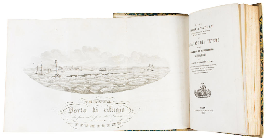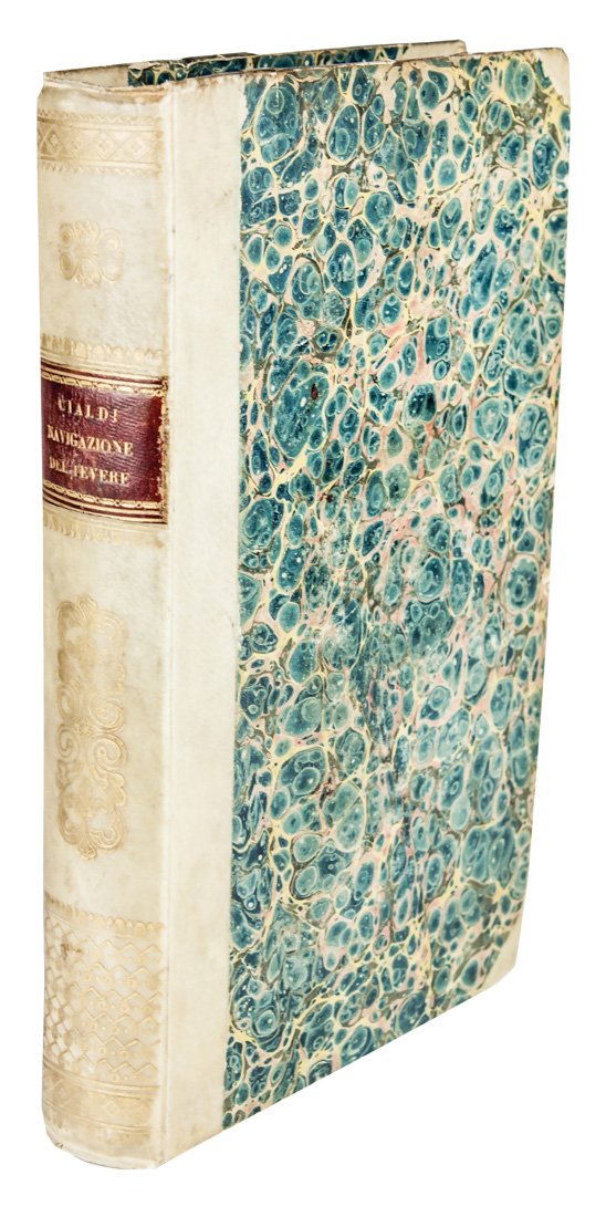 In-8° (mm 218x140). Pagine [6], 416 con una bella Veduta del Porto di rifugio da farsi nella foce del Tevere incisa in rame e ripiegata in antiporta e 5 tavole calcografiche più volte ripiegate in fine. Ottima copia. Legatura coeva in mezza pergamena con punte e piatti in carta marmorizzata, con minime mende; titoli dorati su tassello al dorso.