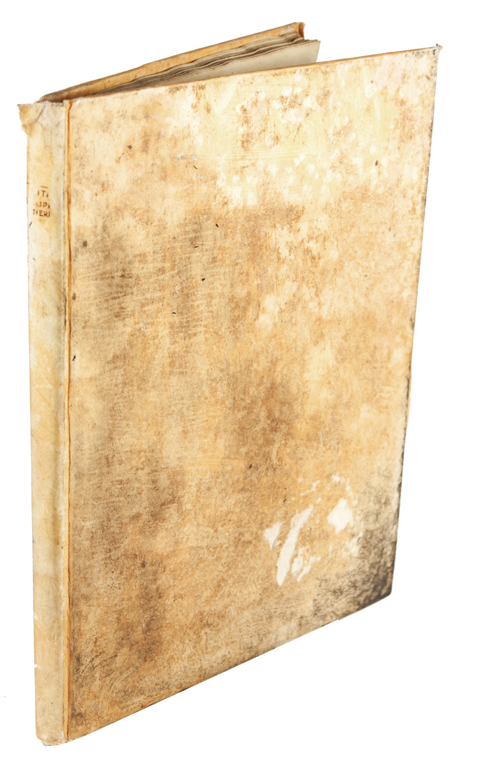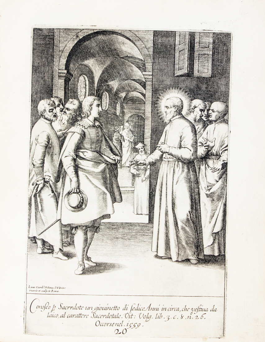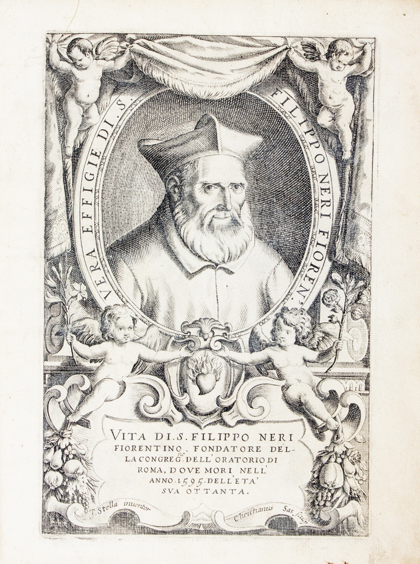 In-4° (mm 260x205). 1 frontespizio calcografico con ritratto di San Filippo Neri e 44 tavole numerate incise in rame con episodi della vita del santo incise da Luca Ciambellano, tranne tre incise da Christian Sas su disegni di Jascques Stella. Bella copia con le incisioni in fresca e nitida tiratura. Cartonato coevo con titoli non più leggibili al dorso e tracce di usura ai piatti.