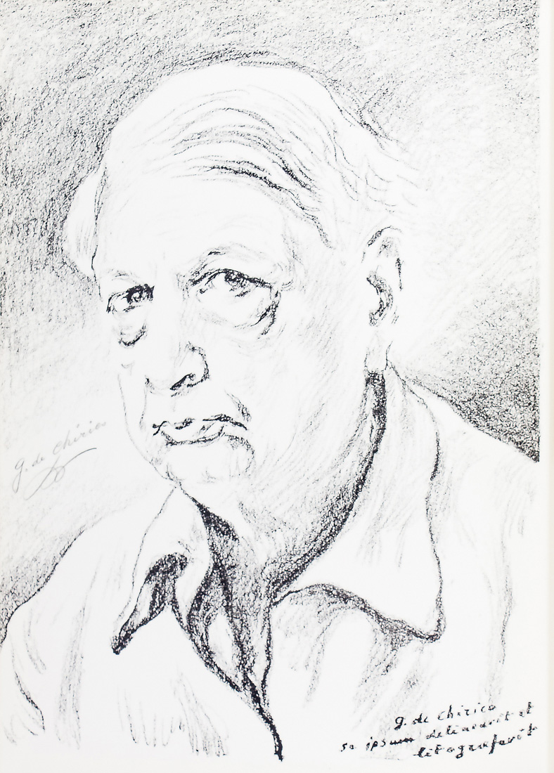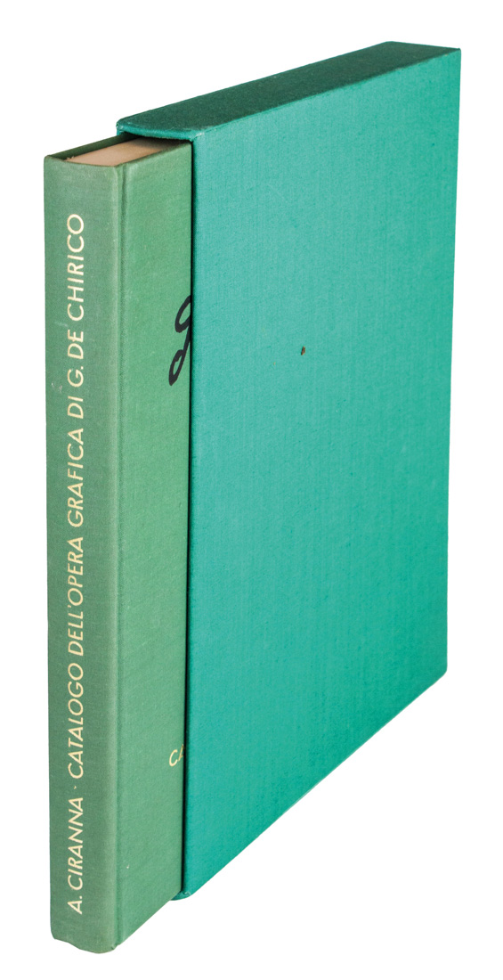 In-4° (mm 360x260). Pagine 214 con 1 Autoritratto inciso in litografia in antiporta e 178 riproduzioni di opere grafiche di De Chirico. Esemplare n. 882/1500 con una litografia originale di De Chirico firmata in lastra e nella nostra copia anche a matita. Legatura editoriale in tela verde con titoli stampati al piatto anteriore, entro astuccio.