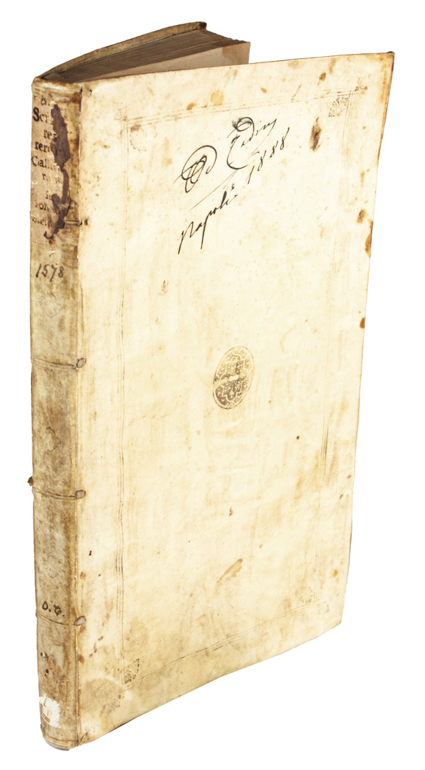 In-folio (mm 330x200). Pagine [8], 320, [28]. Marca dello stampatore incisa in legno al frontespizio e ripetuta più grande in fine, capilettera e testatine xilografiche. Un forellino di tarlo nel testo alle prime carte e un lavoro di tarlo marginale in fine, piccola gora d'acqua nell'angolo superiore esterno delle carte. Legatura coeva in piena pergamena con losanga a motivi floreali impressa in oro al centro dei piatti, inquadrati da una cornice di triplice filetto impressa a secco; titoli manoscritti al dorso. Nota di possesso seicentesca al frontespizio, altra nota ottocentesca al piatto anteriore. (2)