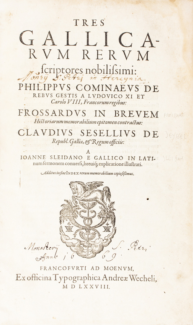 Commines Philippe (de), Froissart Jean, Seyssel Claude, Tres Gallicarum rerum scriptores nobilissimi: Philippus Cominaeus De rebus gestis a Ludouico XI et Carolo VIII, Francorum regibus. Frossardus In brevem historiarum memorabilium epitomen contractus. Claudius Sesellius De Republ. Galliae & regum officiis...