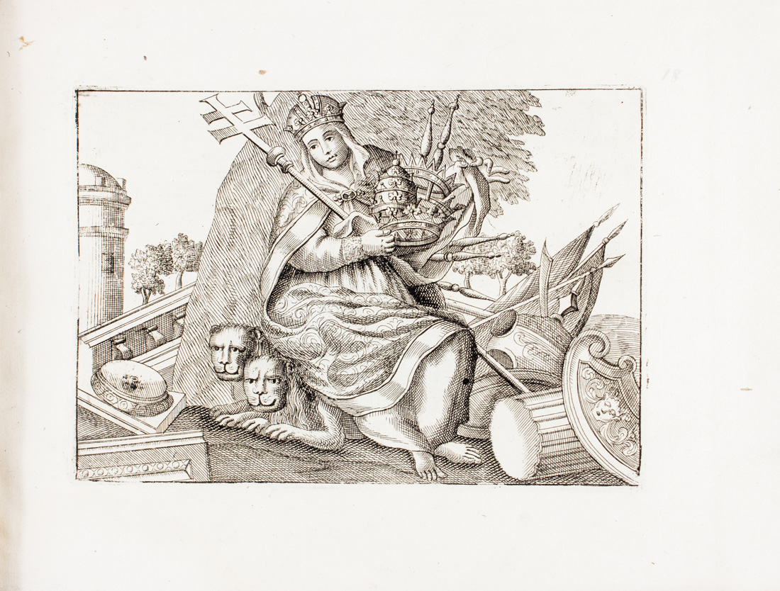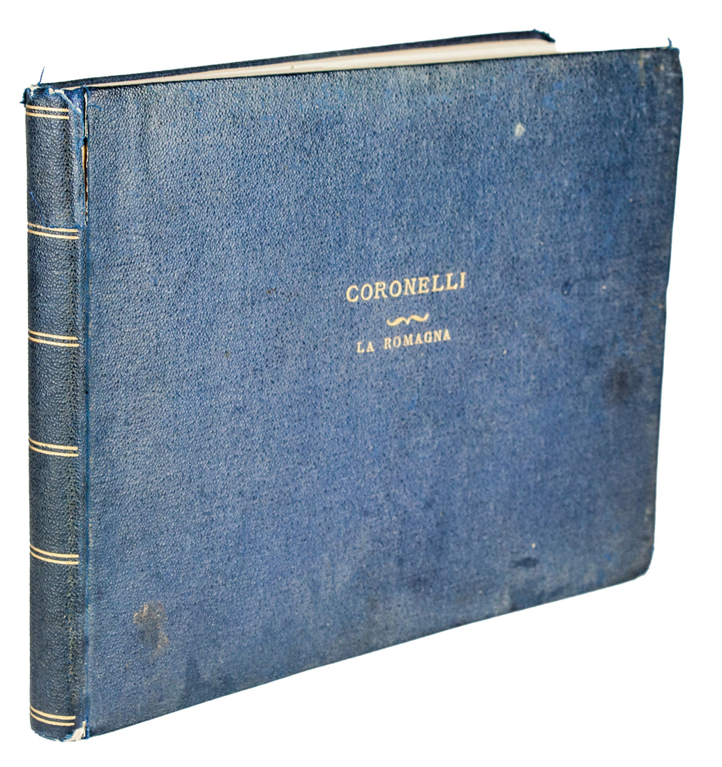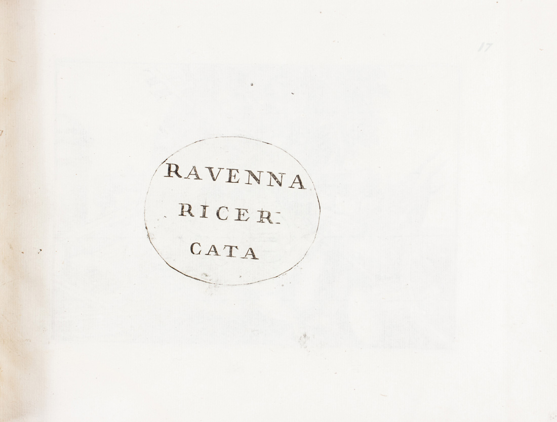 2 parti in 1 album in-8° oblungo (mm 193x265). Carte [19] (di 21?) con occhietto, frontespizio, 1 legenda e 16 tavole anche più volte ripiegate, il tutto finemente inciso in rame - tranne la legenda. SEGUE: Id., Ravenna ricercata. S.n.t. Carte [80] (di 84?) con occhietto, 2 carte di stemmi, 1 ritratto del cardinale Gualtiero, 1 tavola di blasoni ravennati, 17 carte di testo e 58 tavole di vedute, piante, monumenti, statue ravennati incise in rame. Qualche lieve alone di umidità, una macchia di inchiostro a due tavole ma bella copia. Legatura moderna in percallina blu con titoli impressi in oro al piatto anteriore, lievemente lisa.
