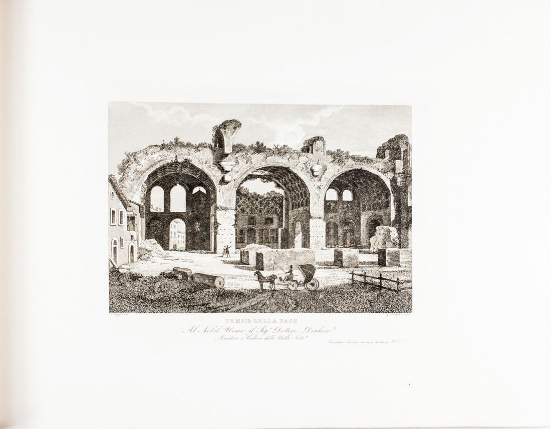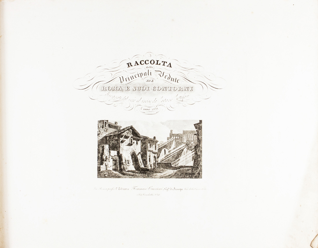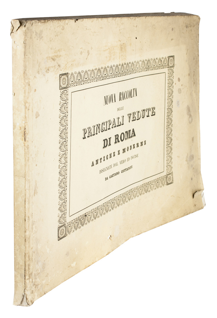 In-folio oblungo (mm 340x460). Frontespizio inciso e 63 tavole di vedute di piazze, monumenti, edifici e rovine romani, inclusa una Veduta di Roma presa dal Monte Gianicolo. Ottima conservazione. Brossura editoriale con titoli stampati al piatto anteriore.