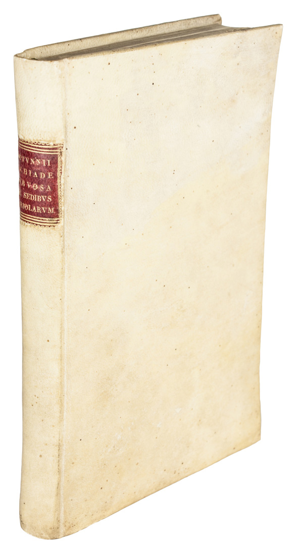 2 opere in 1 volume in-8° (mm 218x140). Pagine 12, 122 con 4 tavole incise in rame fuori testo da Filippo De Grado; manca la carta bianca in fine. LEGATO CON: Id., De sedibus variolarum syntagma. Neapoli et Bononiae: ex typographia sancti Thomae Aquinatis, 1789. Pagine 158 con 1 tavola incisa in rame fuori testo; perduta l'ultima carta bianca. Lievi arrossature ma ottima copia. Legatura coeva in pergamena rigida con titoli calligrafati al dorso.