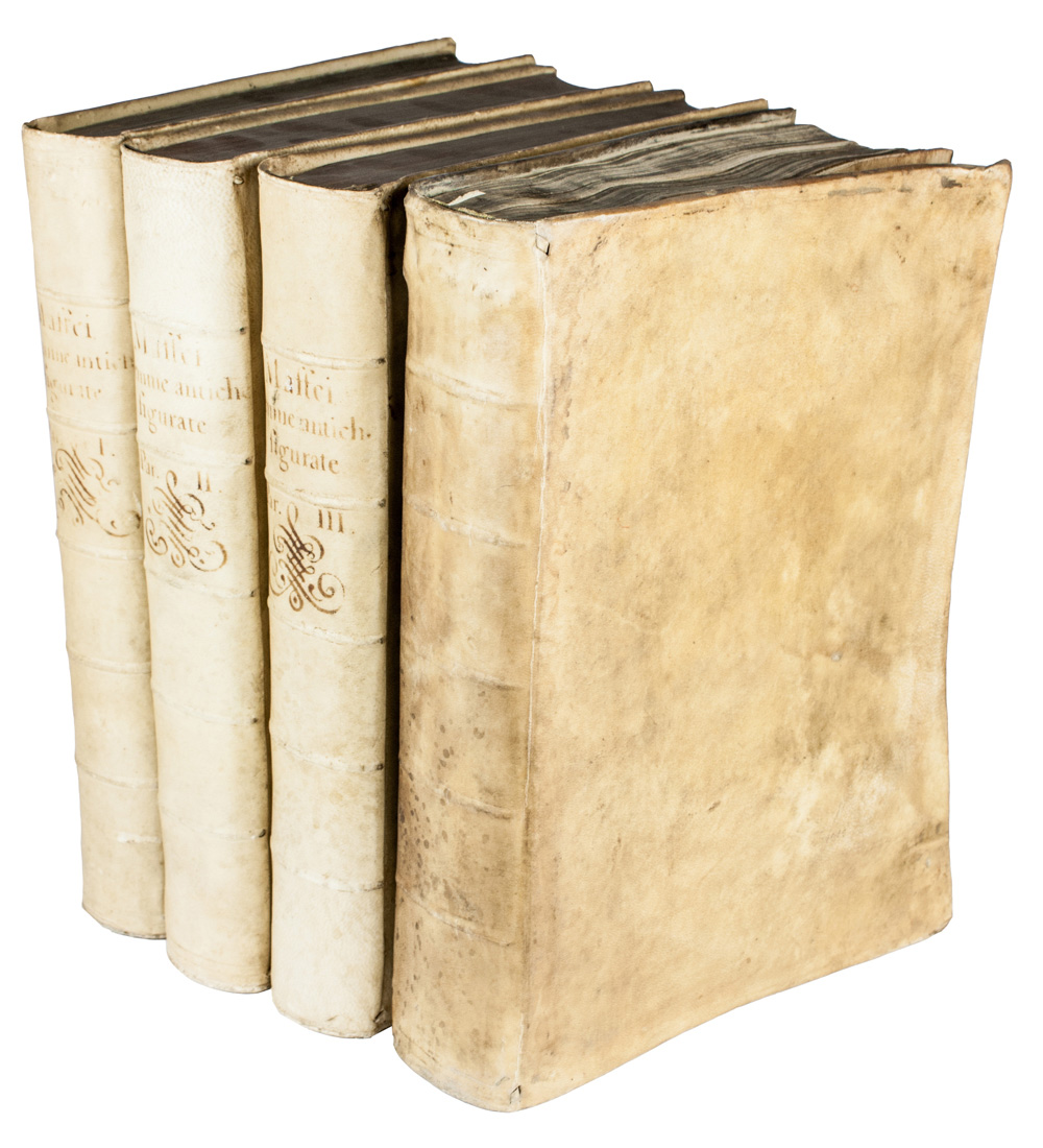 4 volumi in-4° (mm 283x210). Pagine XXXII, 130, [14]; [8], 234, [6], 21, [3]; [12], 224, [6], 19, [3]; XV, [1], 206, [4], 17, [1]. Con nel complesso 419 belle tavole calcografiche numerate e non, fuori testo raffiguranti gemme di cui alcune anche ripiegate (rispettivamente 106, 105, 103 e 105). Arrossature sparse, talvolta intense, ma nel complesso buona conservazione dei primi tre volumi, mentre il quarto ha evidenti tracce di fango, le carte ondulate dall'umidità e la prima tavola unita alla carta di testo precedente per effetto del fango. Legatura coeva in piena pergamena con titoli manoscritti al dorso, quella del quarto volume deformata dall'umidità.(4)