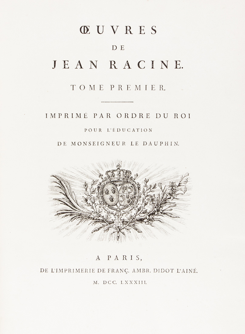3 volumi in-4° (mm 306x225). Pagine XXVII, [1], 463, [1]; [4], 483, [1]; [4], 393, [3]. Contiene la carta con il Brevet «qui ordonne au sieur Didot l'Aîné d'imprimer pour l'education de M. Le Dauphin différentes éditions des Auteurs françois et latin». Uno dei 200 esemplari della tiratura di testa in formato in quarto. Ottimo stato. Legatura coeva in marocchino nocciola con cornice di gusto neoclassico riquadrata da filetti impressa in oro ai piatti e altra bordura a fregi floreali più interna sempre dorata, dentelles alle unghiature, titoli dorati su tasselli e ricco decoro al dorso; tagli dorati. Lievi abrasioni ai dorsi.(3)