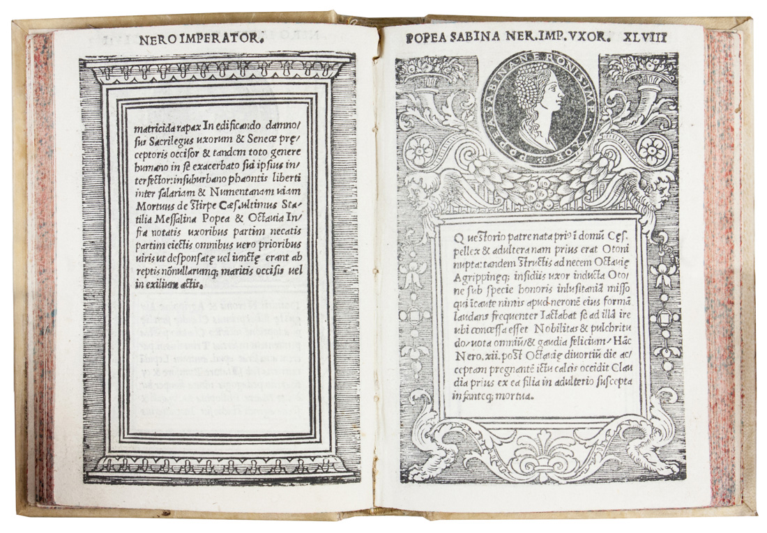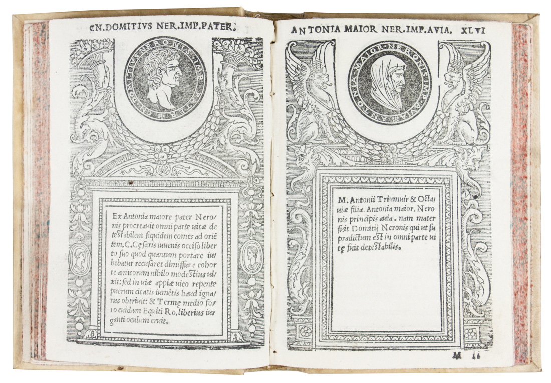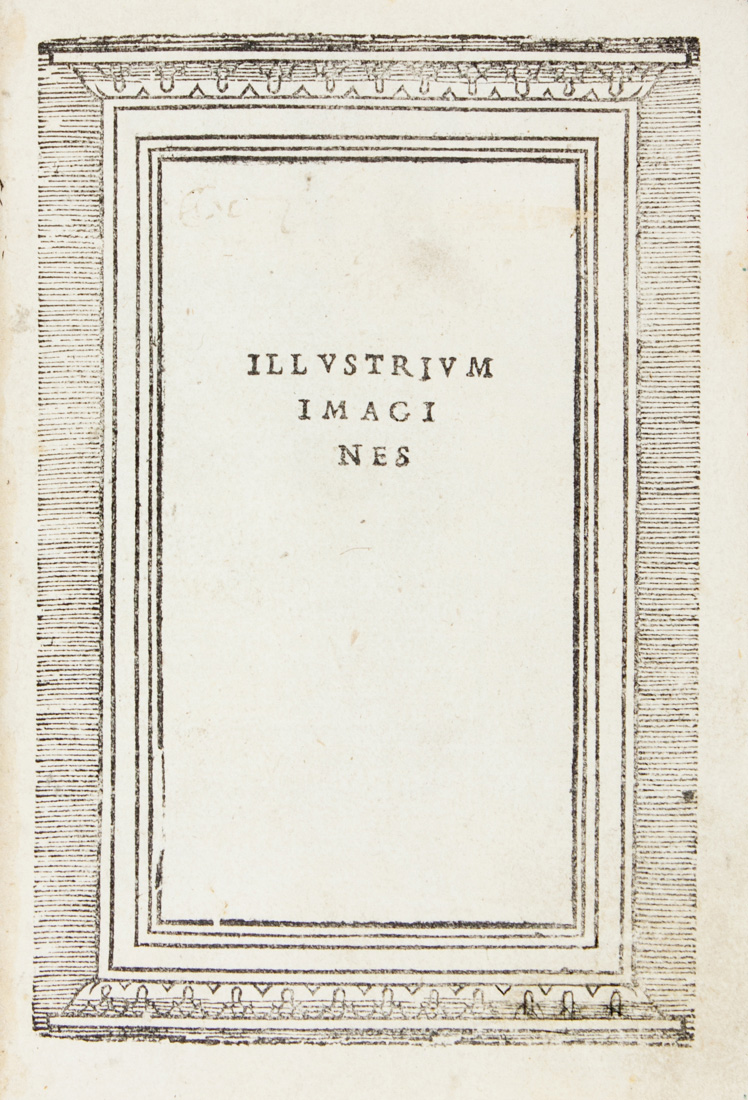 In-8° (mm 140x100). Carte CXX. Frontespizio entro bordura xilografica, marca dello stampatore al colophon e 202 ritratti entro medaglioni a sfondo nero inseriti in elaborate cornici architettoniche con al centro breve biografia. Esemplare rifilato, soprattutto nel margine superiore, con piccolo strappetto ben riparato al frontespizio e lacuna reintegrata nel margine inferiore bianco della carta di Dedica. Legatura ottocentesca in piena pergamena con titoli manoscritti al dorso, sguardie rinnovate.