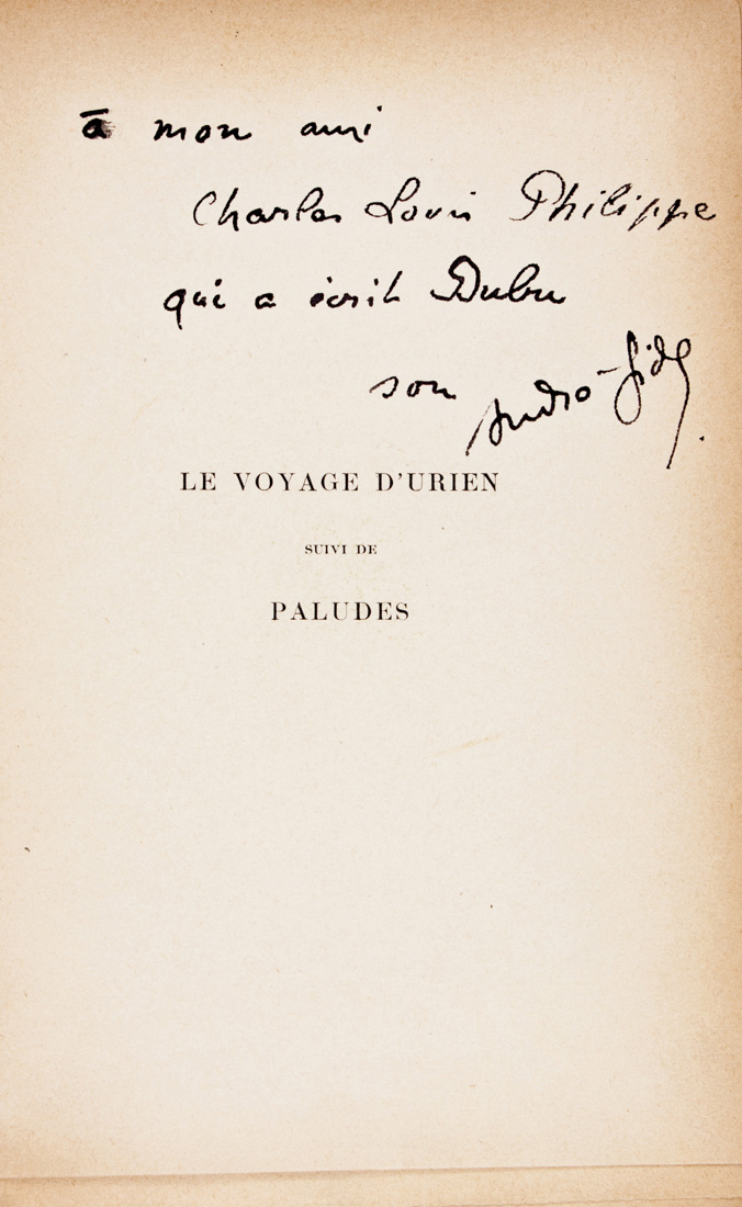 In-8° (mm 185x120). Pagine [2], 290, [4] (incluso un estratto del catalogo del Mercure de France). Esemplare lievemente ingiallito e allentato internamente, con uno strappo nel testo senza perdite alle ultime 6 carte. Brossura editoriale, con piccole mancanze al dorso. Dedica autografa di André Gide «à mon ami Charles Louis Philippe qui a écrit Bubu».