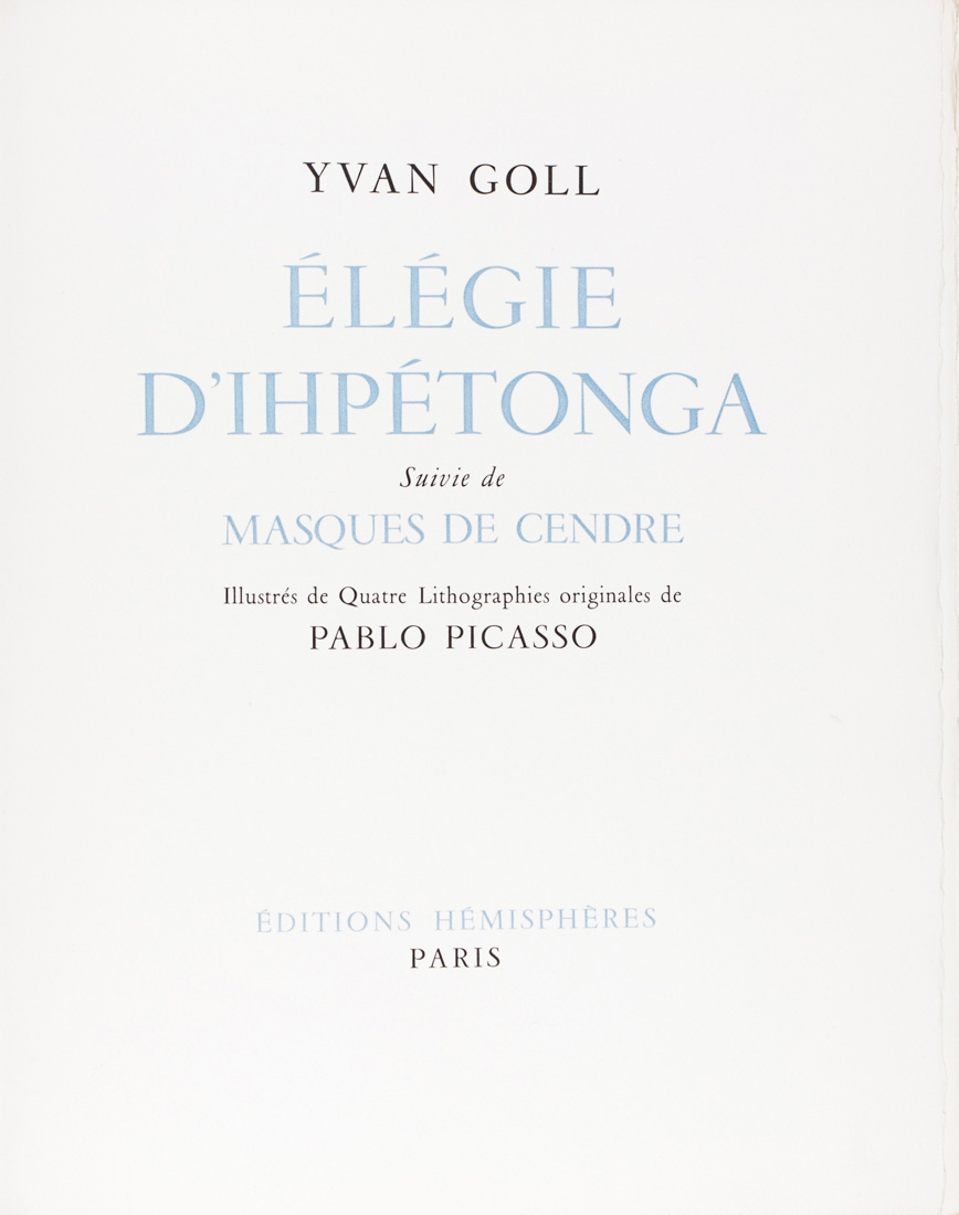 Goll Yvan, Élégie d'Ihpétonga. Suivie de Masques de Cendre. Illustrés de Quatre Lithographies originales de Pablo Picasso.