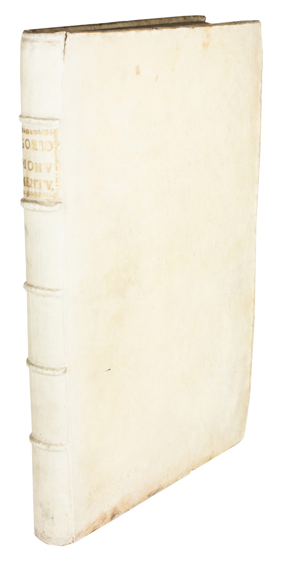 In-folio (mm 340x220). Pagine XXXVI, 254, [2] con 21 splendide tavole ripiegate numerate incise in rame fuori testo. Frontespizio in inchiostro rosso e nero con bella vignetta calcografica, graziose testatine e capilettera incisi in rame, moltissime epigrafi e iscrizioni riprodotte in xilografia nel testo. Lieve gora d'acqua nel margine inferiore delle carte, altrimenti ottimo esemplare ad ampi margini. Legatura coeva in pergamena rigida con titoli impressi in oro al dorso, in buono stato nonostante le sguardie distaccate e un taglio alla cerniera del piatto anteriore.