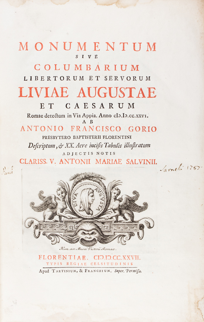 Gori Antonio Francesco, Monumentum sive Columbarium libertorum et servorum Liviae Augustae et Caesarum Romae detectum in Via Appia. Anno 1726...
