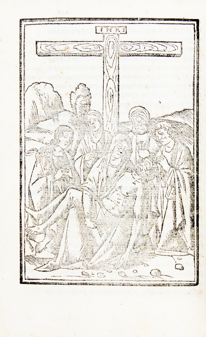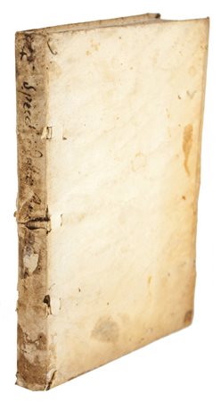 In-8° (mm 151x102). Carte 122, [2]. Marca dello stampatore al frontespizio, qualche capolettera figurato e 3 belle xilografie a piena pagina nel testo. Esemplare molto allentato internamente, soprattutto al piatto anteriore, con lievi fioriture sparse. Legatura coeva in pergamena semifloscia con lacerti di legacci, piccole mancanze al dorso e piatti un po' macchiati.