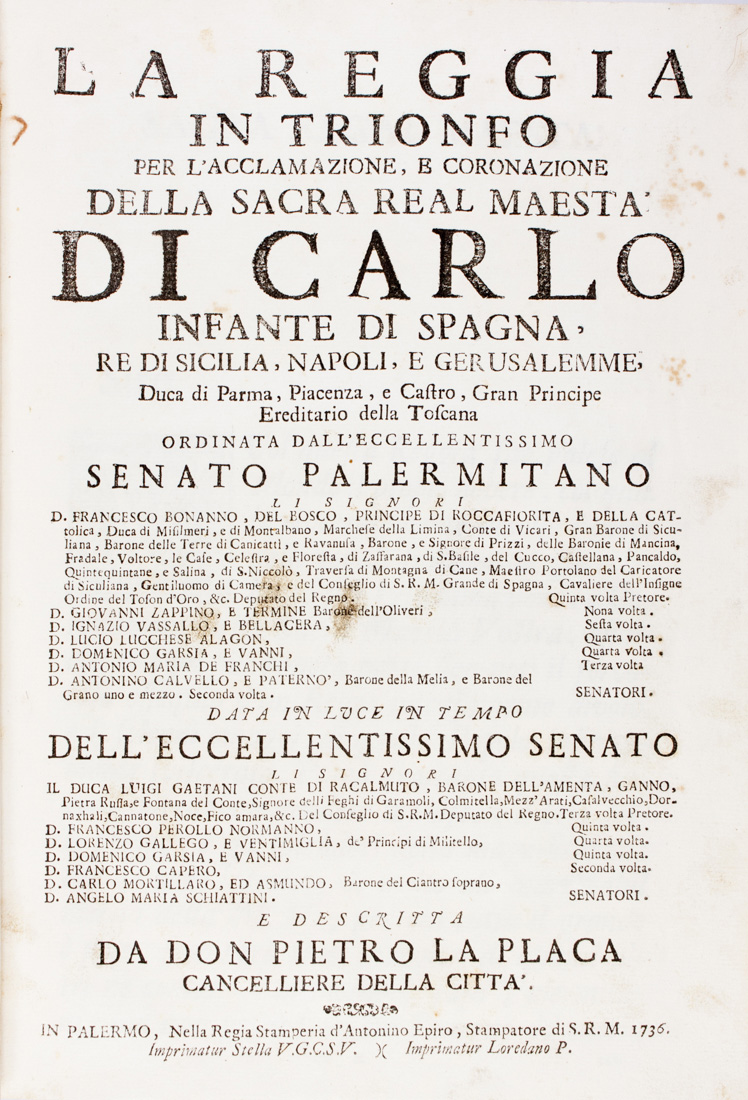 In Palermo: Nella Regia Stamperia d'Agostino, ed Antonino Epiro, 1736.