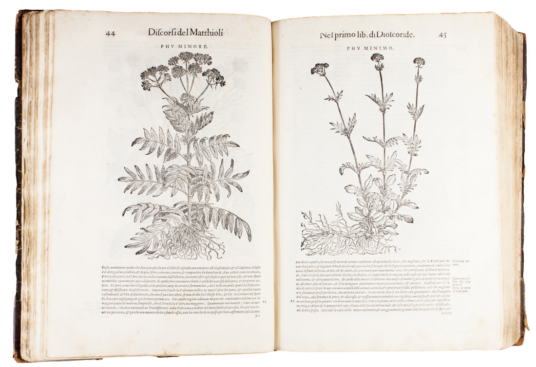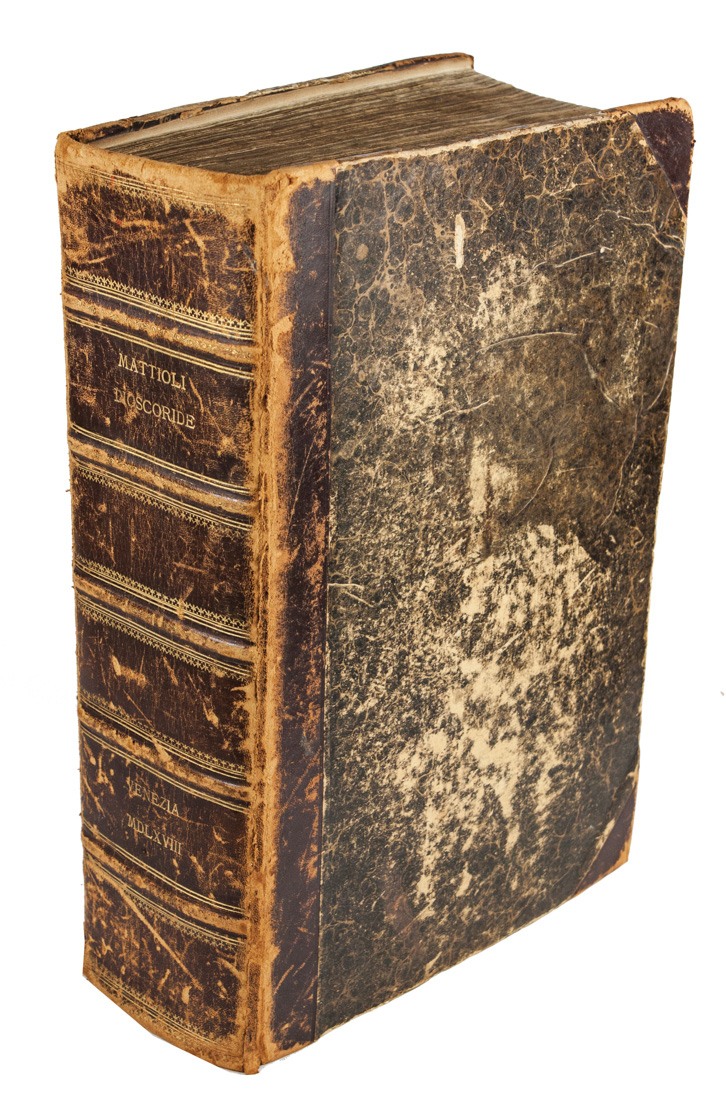 In-folio (mm 360X250). Pagine [180], 1527, [13]. Marca tipografica xilografica al frontespizio ripetuta in fine e in principio dell'appendice Del modo di distillare le acque da tutte le piante, bel ritratto dell'Autore in ovale inciso a piena pagina a carta m8v e innumerevoli xilografie a tre quarti di pagina raffiguranti erbe, fiori, vegetali e animali; nell'appendice in fine 6 grandi xilografie rappresentanti strumenti per la distillazione. Frontespizio riapplicato e rovinato, con strappi e lacune riparati con pecette, e un maldestro restauro a una carta ma per il resto esemplare completo e in discreto stato di conservazione, con le illustrazioni in fresca e nitida impressione: lievi arrossature sparse, qualche occasionale macchia e qualche strappetto marginale, alcune carte un po' brunite. Legatura ottocentesca in mezza pelle con punte e piatti in cartone marmorizzato, titoli impressi in oro al dorso; spellature a dorso e cerniere, sguardie rinnovate.