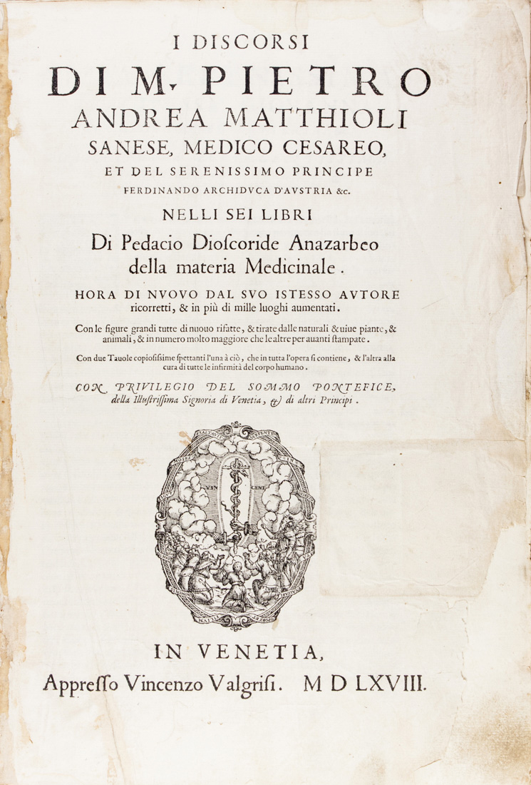 Mattioli Pietro Andrea, Dioscorides Pedanius, I Discorsi [...] nelli sei libri di Pedacio Dioscoride Anazarbeo della materia Medicinale [...] Con le figure grandi tutte di nuovo rifatte, & tirate dalle naturali & vive piante & animali...