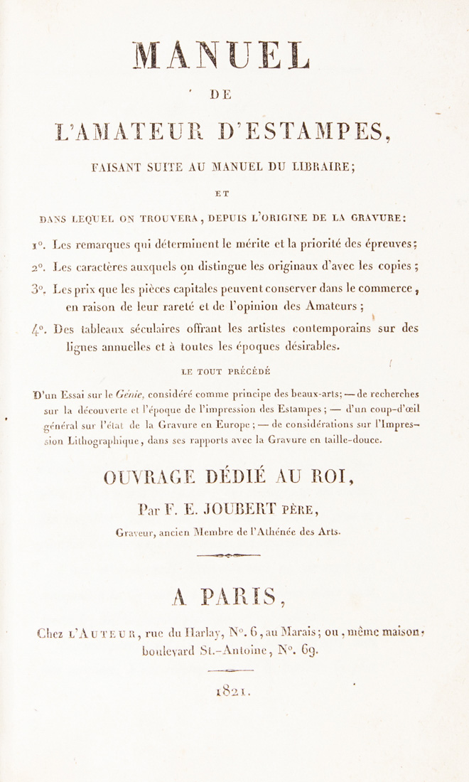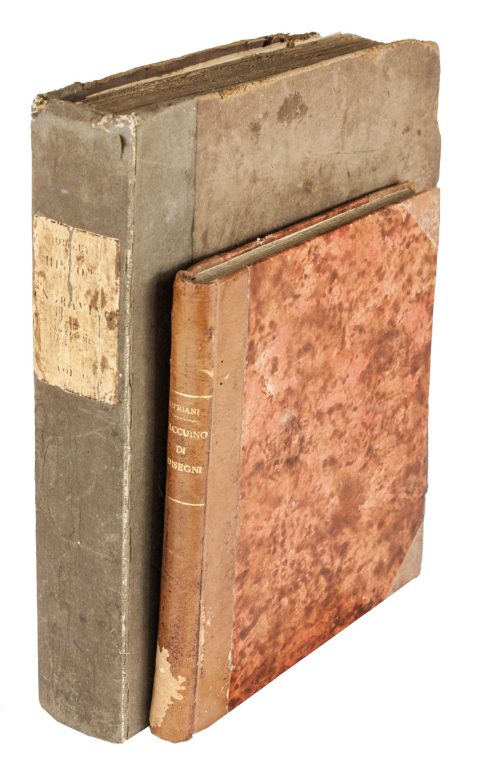 Più opere in 1 volume in-8° (mm 205x140). Nel volume sono legati anche Gandini Antonio, Catalogo di mille ottocento e più autografi di personaggi... Modena: Eredi Soliani, 1837; Nota degli autografi più insigni della collezione di C. E G. Campori... S.n.t. e alcune placchette. Legatura moderna in piena percallina verde, conservate all'interno le brossure delle due pubblicazioni principali. SI AGGIUNGE: Gori Gandellini Giovanni, Notizie storiche degl'intagliatori. Siena: Pazzini Carli, 1771. 2 volumi (di 3) in-8° (mm 215x145). Esemplare in barbe, completo dei 2 ritratti. SI AGGIUNGE: Joullain François Charles, Reflexions sur la peinture et la gravure... Metz: Claude Lamort, 1786. In-8° (mm 180x110). Esemplare completo e in barbe ma con l'ultimo fascicolo conservato slegato all'interno. Cartonato coevo con mancanze ai piatti e lavoro di tarlo. SI AGGIUNGE: Joubert François Etienne, Manuel de l'amateur d'estampes... Paris: Chez l'Auteur, 1821. 3 volumi in-8° (mm 200x125). Opera completa. Legatura coeva in mezza pelle con titoli impressi in oro su tassello al dorso; difetti alla cerniera di un volume. SI AGGIUNGE: Cipriani Giovanni Battista, Taccuino di disegni di ogni specie. Roma: s.e., 1811. SI AGGIUNGE: Ottley William Young, An inquiry into the origin and early history of engraving. London: M'Creery, 1816. 1 volume (di 2).(9)