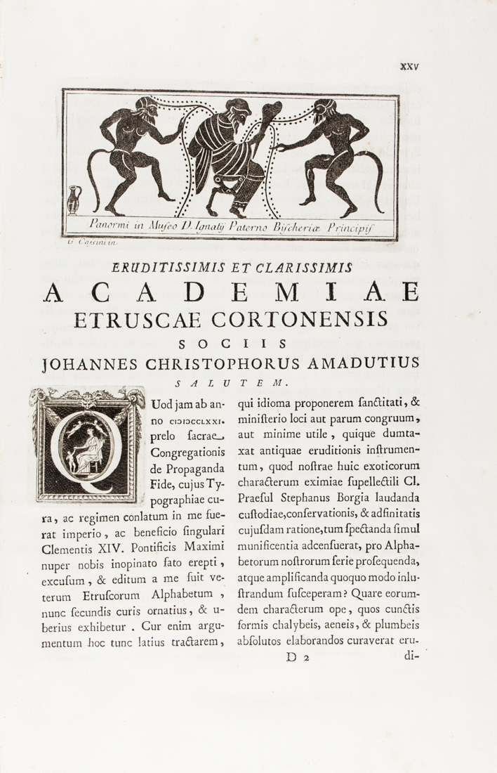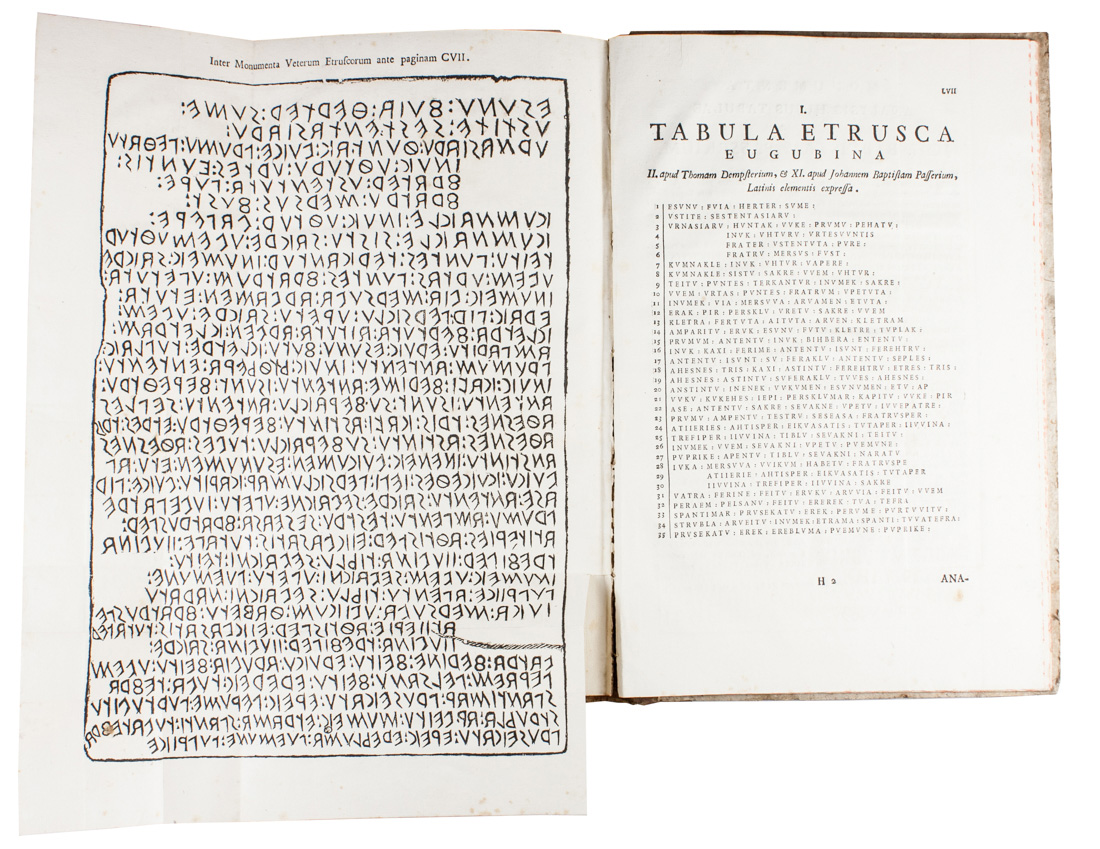 In-folio (mm 383x250). Pagine LXXXVII, [3] con 3 tavole fuori testo raffiguranti il monumento marmoreo nolano e 1 tavola con l'Iscrizione Eugubina ripiegata fuori testo. Vignetta calcografica al frontespizio, splendide testatine e capilettera incisi in rame e altre illustrazioni nel testo incise da Cunego, Cassini e Orazi. Lievemente allentato all'interno e con qualche minima menda, ma bella copia. Legatura coeva in mezza pelle con punte e piatti in carta xilografata, lisa.