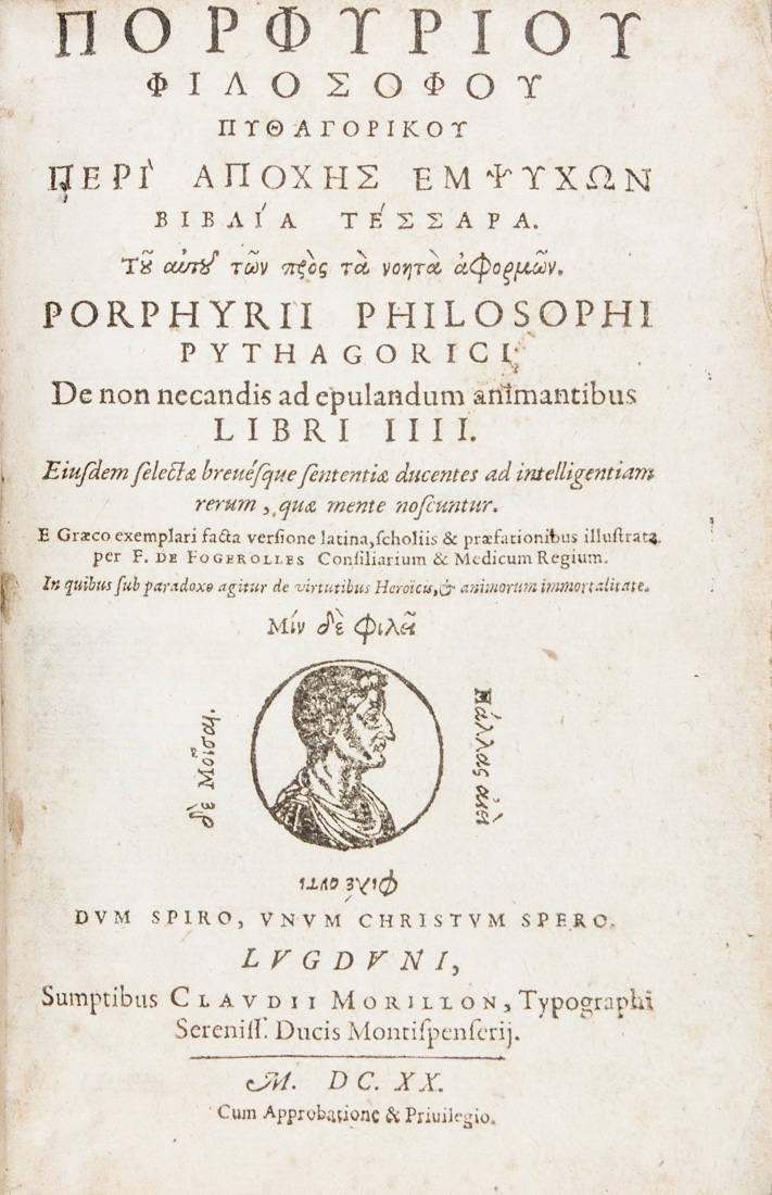 Porphyrius, Peri apoches empsychon biblia tessara [...]. De non necandis ad...