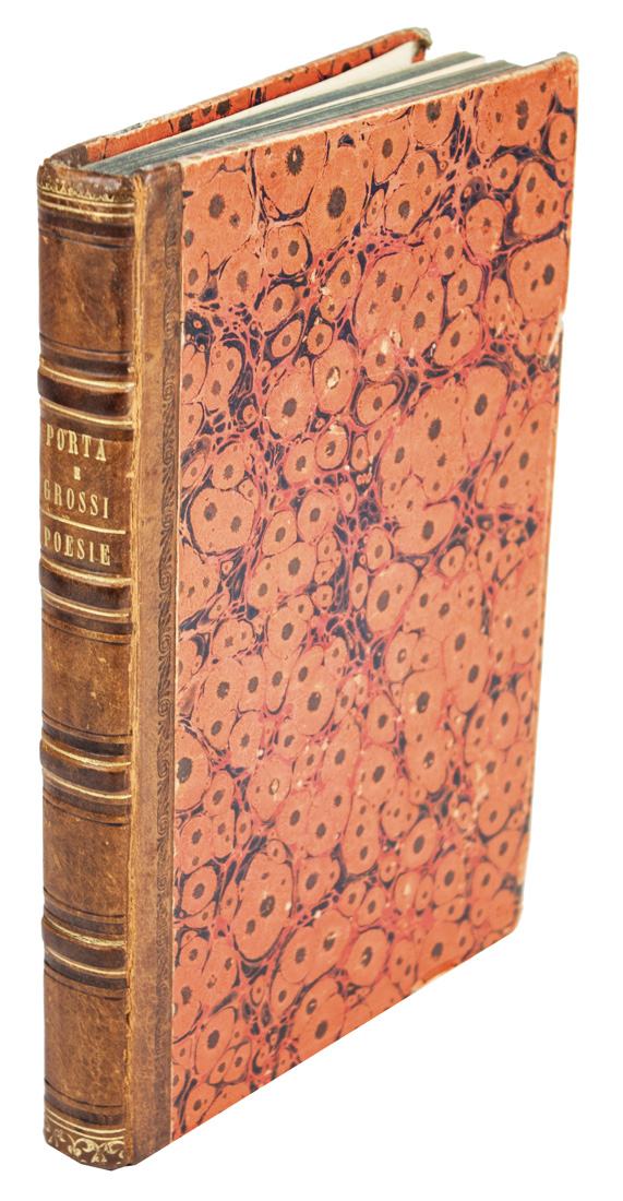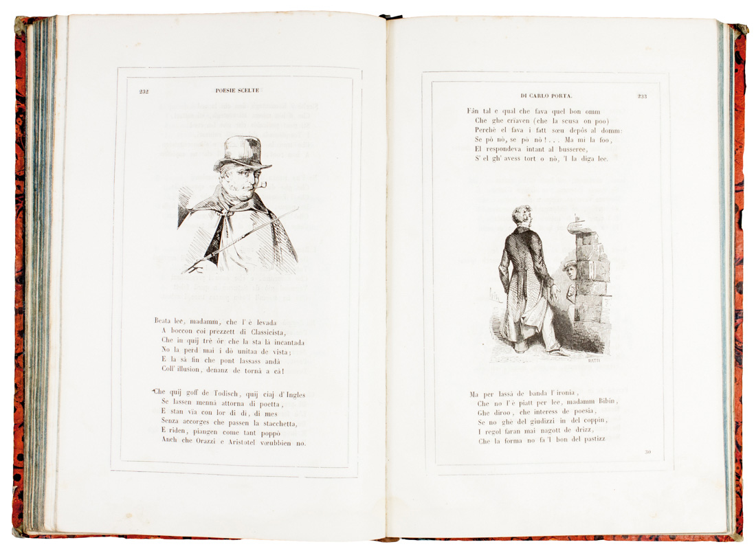 In-8° grande (mm 250x170). Pagine [2], 460, [4]. Antiporta in seppia e frontespizio con vignetta incisa in legno, 1 ritratto calcografico di Porta fuori testo. All'interno numerose xilografie e testo incorniciato in doppio filetto e decorato da capilettera, testatine e finalini. Gora d'acqua al margine inferiore e lievi arrossature. Piccolo restauro a due carte. Legatura coeva in mezza pelle con piatti in carta xilografata con titoli impressi in oro al dorso; leggere abrasioni ai piatti e punte lievemente lise.