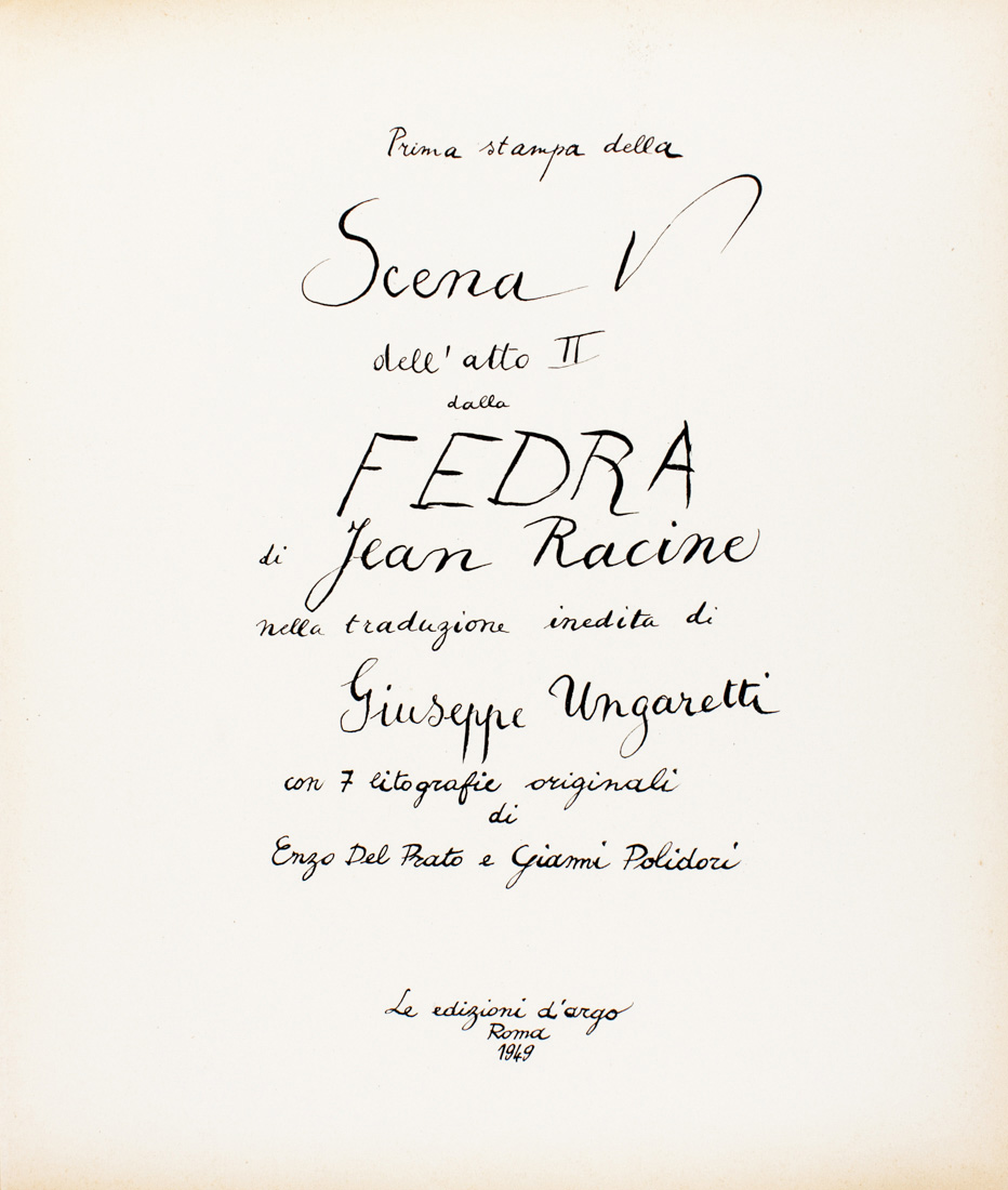 Racine Jean, Ah! Cruel,... J'aime. Prima stampa della Scena V dell'atto II dalla Fedra [...] nella traduzione inedita di Giuseppe Ungaretti con 7 litografie originali di Enzo del Prato e Gianni Polidori.