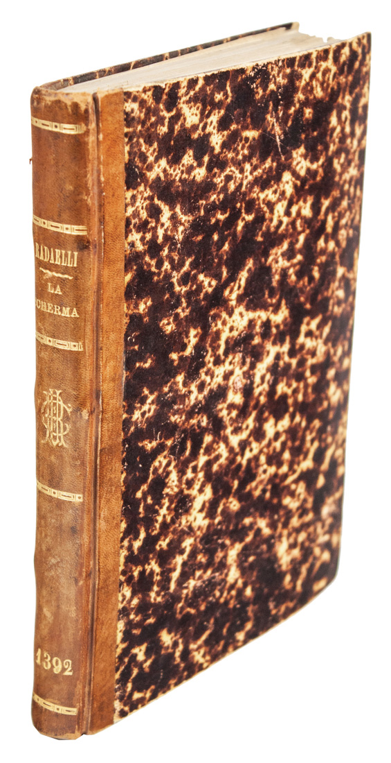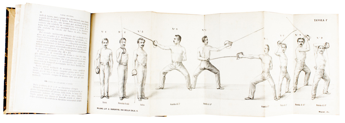 In-8° (mm 201x147). Pagine 103 con 1 tavola di quadro sinottico a doppia pagina e 10 litografie più volte ripiegate fuori testo disegnate da Bigoni con le pose della scherma. Legatura coeva in mezza pelle con piatti marmorizzati, titoli impressi in oro al dorso.