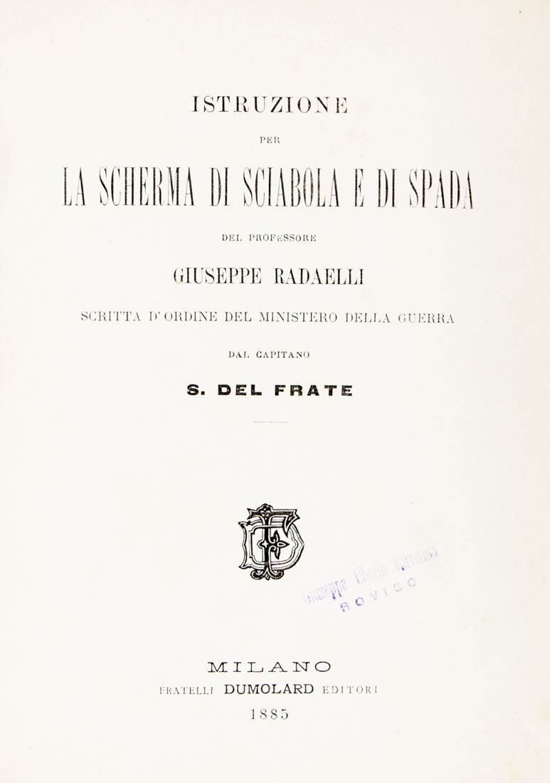 Radaelli Giuseppe, Istruzione per la scherma di sciabola e di spada [...] scritta per ordine del Ministero della guerra dal capitano S. Del Frate.