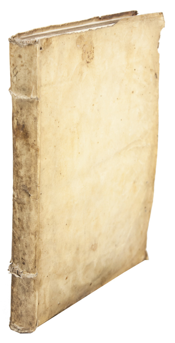 In-4° (mm 288x160). Carte [8], 112, [2]. Emblema dell'Autore al frontespizio e marca dello stampatore in fine incisi in legno, capilettera e testatine xilografici e 9 figure di diagrammi astrologici incise in legno nel testo anche a piena pagina. Primo e ultimo quaderno ricuciti ma non provenienti da altro esemplare, lacuna nel margine interno di una carta, lavoro di tarlo marginale a poche carte centrali e tracce di sporco sparse ma buona copia. Legatura muta coeva in pergamena semifloscia con lacerti di legacci e restauri al contropiatto posteriore, sguardie rinnovate.