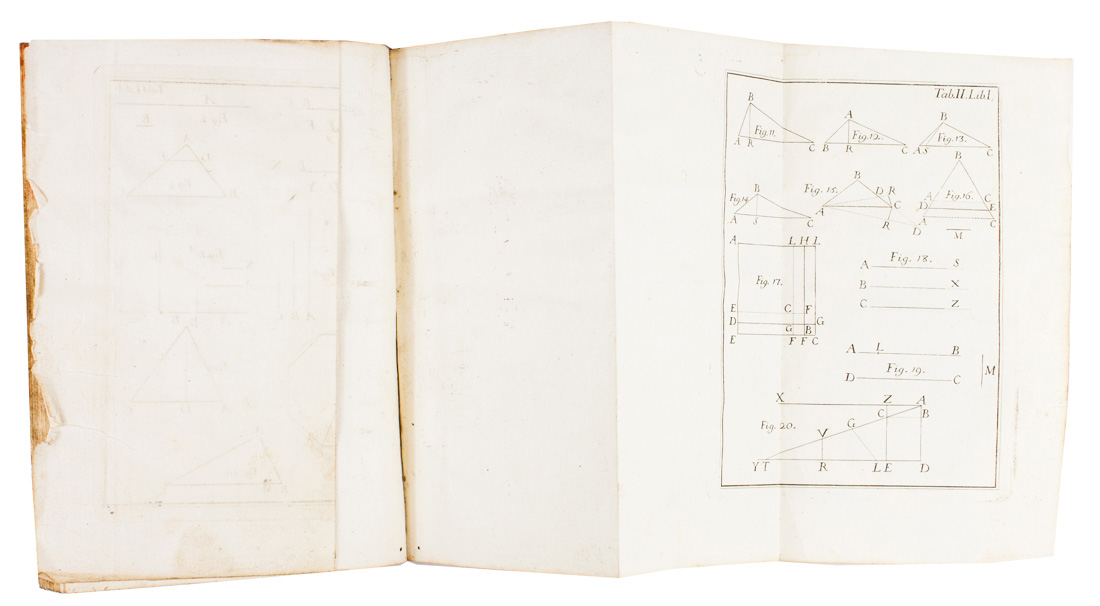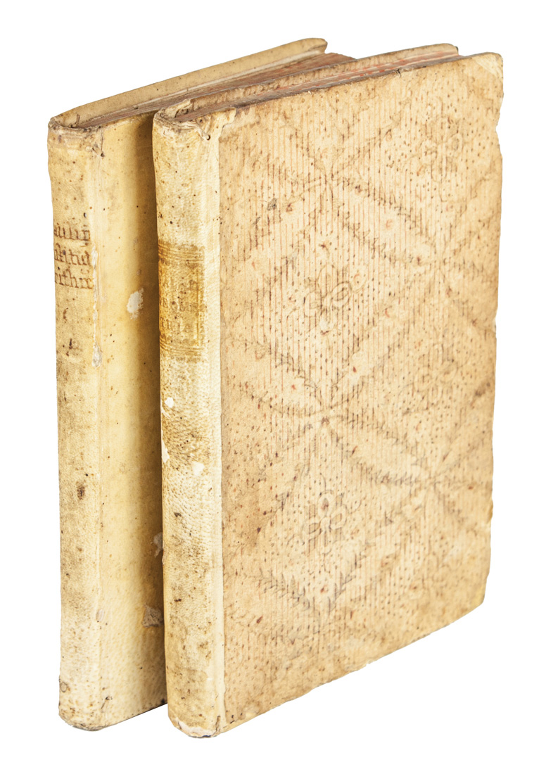 In-4° (mm 210x140). Pagine XIV, [2], 139, [3] con 9 tavole geometriche incise in rame fuori testo. Vignetta calcografica al frontespizio stampato in inchiostro rosso e nero e capilettera xilografici. Leggere macchie d'inchiostro nel margine interno di due carte, altri minimi difetti ma buona copia. Legatura coeva in mezza pergamena con piatti rivestiti in carta xilografata, titoli impressi in oro al dorso e ormai svaniti. Nota di possesso manoscritta al frontespizio. SI AGGIUNGE: Paolino di San Giuseppe [pseud. di Chelucci Domenico], Institutiones arithmeticae cum appendice de natura, atque usu logarithmorum... Romae: typis Joannis Zempel, 1743. In-4° (mm 205x155). Pagine XVI, 159, [1] bianca. Fregio al frontespizio, capilettera e testatine, schemi matematici nel testo, il tutto xilografico. Lievi macchie. Legatura coeva in piena pergamena rigida con titoli manoscritti al dorso, con minimi difetti. (2)