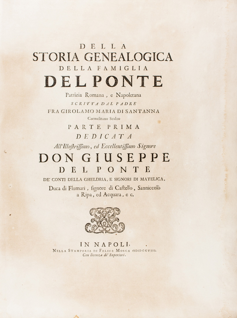 Sant'Anna Girolamo Maria di, Della storia genealogica della famiglia Del Ponte patrizia romana, e napoletana [...]. Parte prima... (-unica pubblicata).