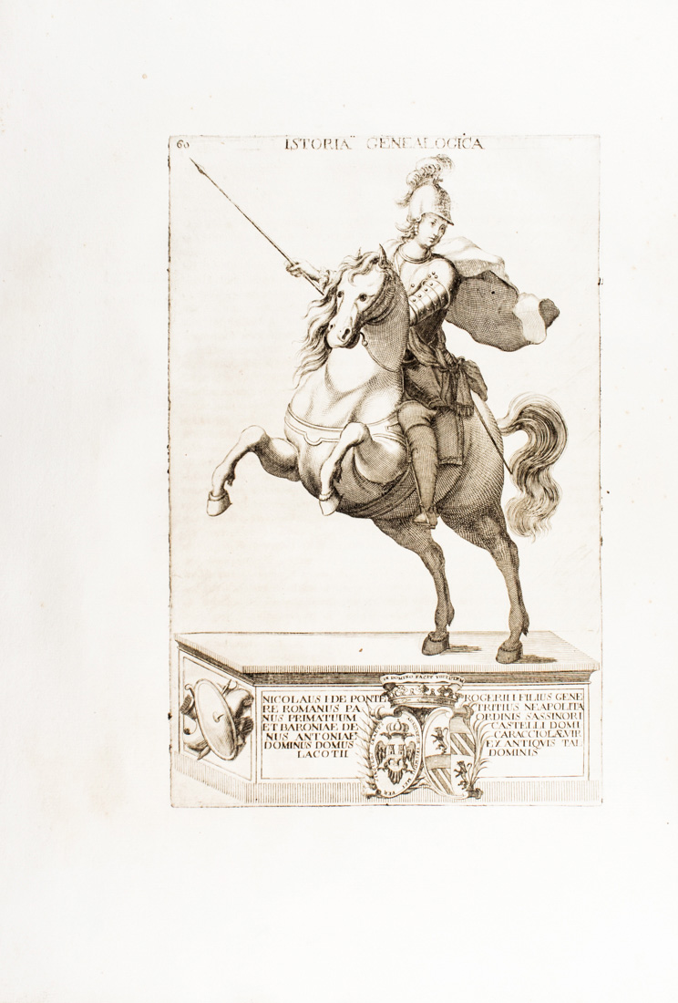 In-folio (mm 490x370). Pagine [16], 96, [4], 97-112, [12], 113-160, [4], 161-194, [11] con un'antiporta allegorica, 2 alberi genealogici a doppia pagina e ripiegati, 10 tavole numerate in 5 carte fuori testo e 65 ritratti a piena pagina nel testo, il tutto inciso in rame da Gaetano e Andrea Magliar. Esemplare brunito, con lievi gore marginali, arrossature sparse a tratti intense, uno strappo marginale a una tavola ma nel complesso discreta copia. Legatura coeva in pergamena con titoli manoscritti al dorso, con macchie e gore ai piatti