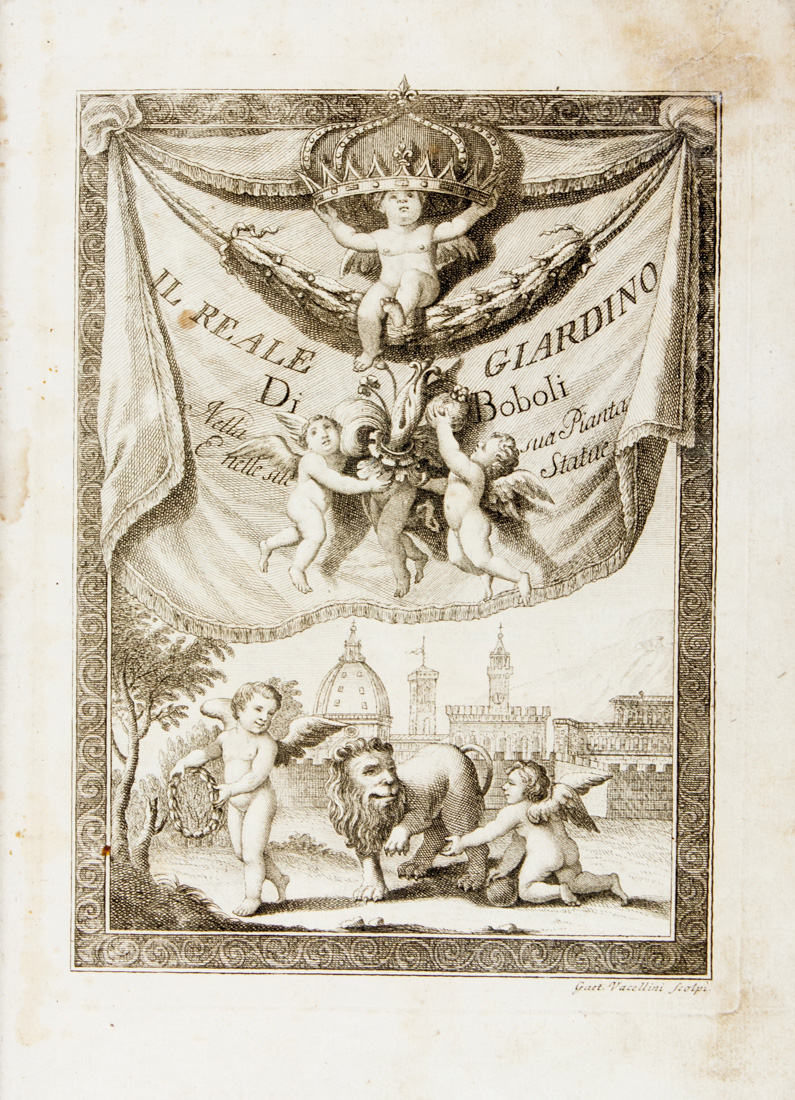 In-4° (mm 264x184). Pagine 80. Frontespizio figurato con veduta ideale di Firenze sullo sfondo, 46 tavole numerate raffiguranti le statue di Boboli e 1 grande pianta più volte ripiegata del Giardino (mm 360x680), il tutto inciso in rame da Gaetano Vascellini. Lieve gora d'acqua alle carte, leggere fioriture sparse e uno strappetto alla pianta lontano dall'inciso ma bella copia. Legatura in mezza pelle coeva con piatti marmorizzati, titoli dorati su tassello al dorso. Con alcune lievi bruniture a poche carte, ma nel complesso buon esemplare, con barbe. Timbro di collezione alla carta di guardia anteriore e in fine.
