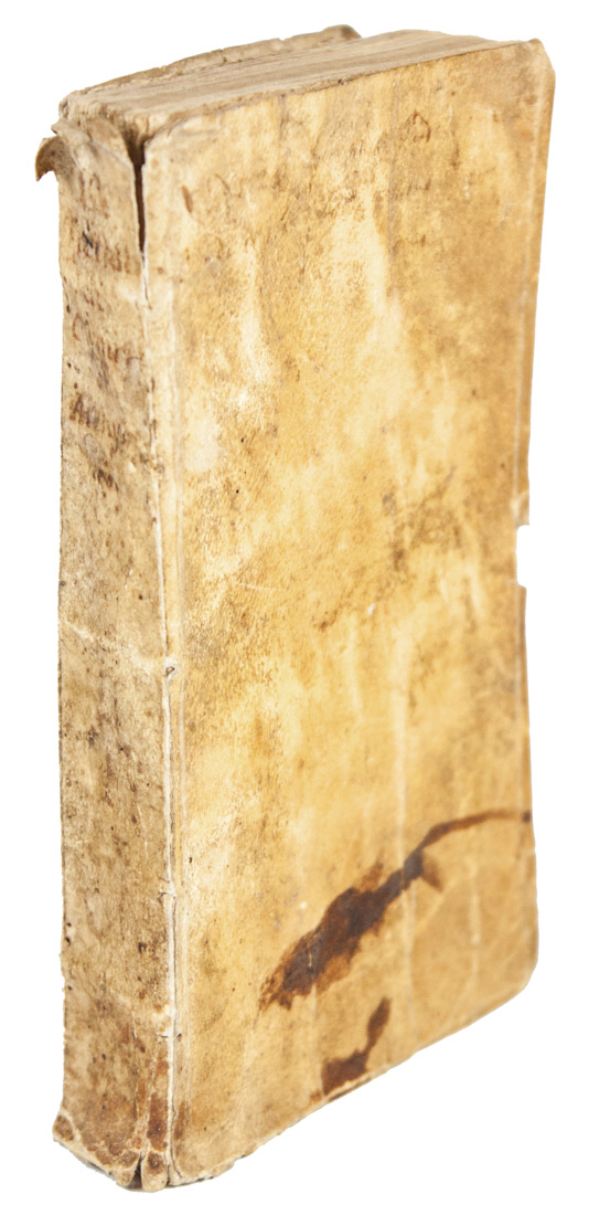 6 opere in 1 volume in-8° (mm 153x95). Pagine 71, [1] con 1 tavola incisa in legno fuori testo e ripiegata. LEGATO CON: Eglinus Iconius Raphael, Disquisitio de Helia artista, in qua de metallorum transformatione adversus Hagelii & Perenii opiniones [...] differitur... Marpurgi: Typis Hutwelckerianis, 1608. [2], 73, [37], le ultime due carte bianche. LEGATO CON: Barnaud Nicolas, Triga chemica: De lapide philosophico tractatus tres... [Lugduni Batavorum]: Ex Officina Plantiniana, apud Christophorum Raphelengium, 1599. Pagine 40, [15], 1 bianca. LEGATO CON: Duval Robert [Vallensis Robertus], De veritate et antiquitate artis chemicae et pulveris sive medicinae philosophorum vel auri potabilis... Lugduni Batavorum: Ex Officina Plantiniana, apud Christophorum Raphelengium, 1593.  Pagine 46, 1 carta bianca. LEGATO CON: Artephius, Clavis maioris sapientiae. Parisiis: s.e., 1609. Pagine [4], 33, [1]. LEGATO CON: Ripley George, Liber duodecim portarum in Barnaud Nicolas, Quadriga aurifera... [Lugduni Batavorum]: Ex Officina Plantiniana, apud Christophorum Raphelengium, 1599. La sola Secunda rota (pp. 23-64), in più scompleta delle pagine 65-70. Forellini di tarlo al frontespizio della prima opera e bruniture diffuse, dovute alla carta del tempo. Legatura coeva in pergamena semifloscia con risvolti, titoli manoscritti ormai sbiaditi al dorso. Macchia di inchiostro al piatto anteriore e altre minime mende. Alcune annotazioni di seicentesca mano al testo.